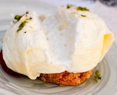 Como lo es la mayonesa de botarga (huevas de atún) con la que acompaña una battuta (batidas) de gambas crudas; la falsa pizza hecha con un anillo de pasta crujiente con tropezones de pescado ahumado, mozzarella y puré de patata; o la sepia en su tinta que adopta la forma de un falso huevo duro. Obsesionado con el blanco y negro de la sepia, Cuttaia ha creado un arriesgado menú bicolor una propuesta que invita al comensal a adentrarse en cocina más creativa.