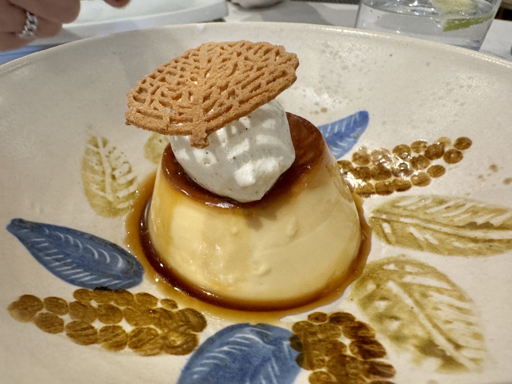 El momento dulce se salda con resultados desiguales. Resulta difícil entender el escabeche de zanahoria morada con dulce de naranja, helado de leche y granizado de naranja, jengibre e hinojo marino encurtido. De nuevo un popurrí extraño en el que se obliga a armonizar lácteos con cítricos. Otra complejidad innecesaria. Por el contrario, resulta monumental el flan, un hito de la casa.