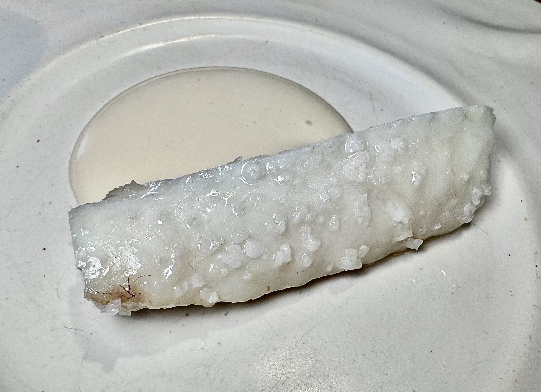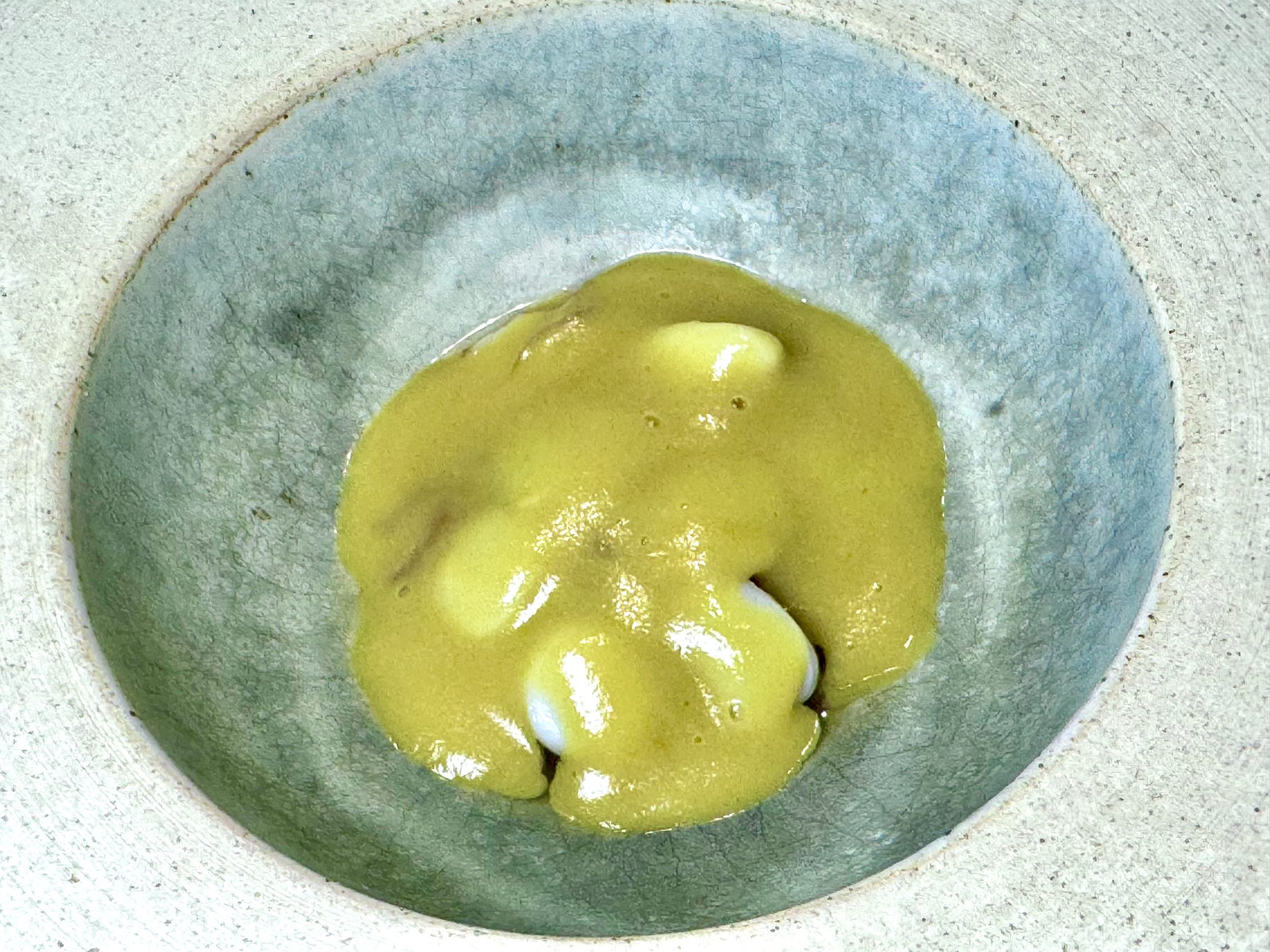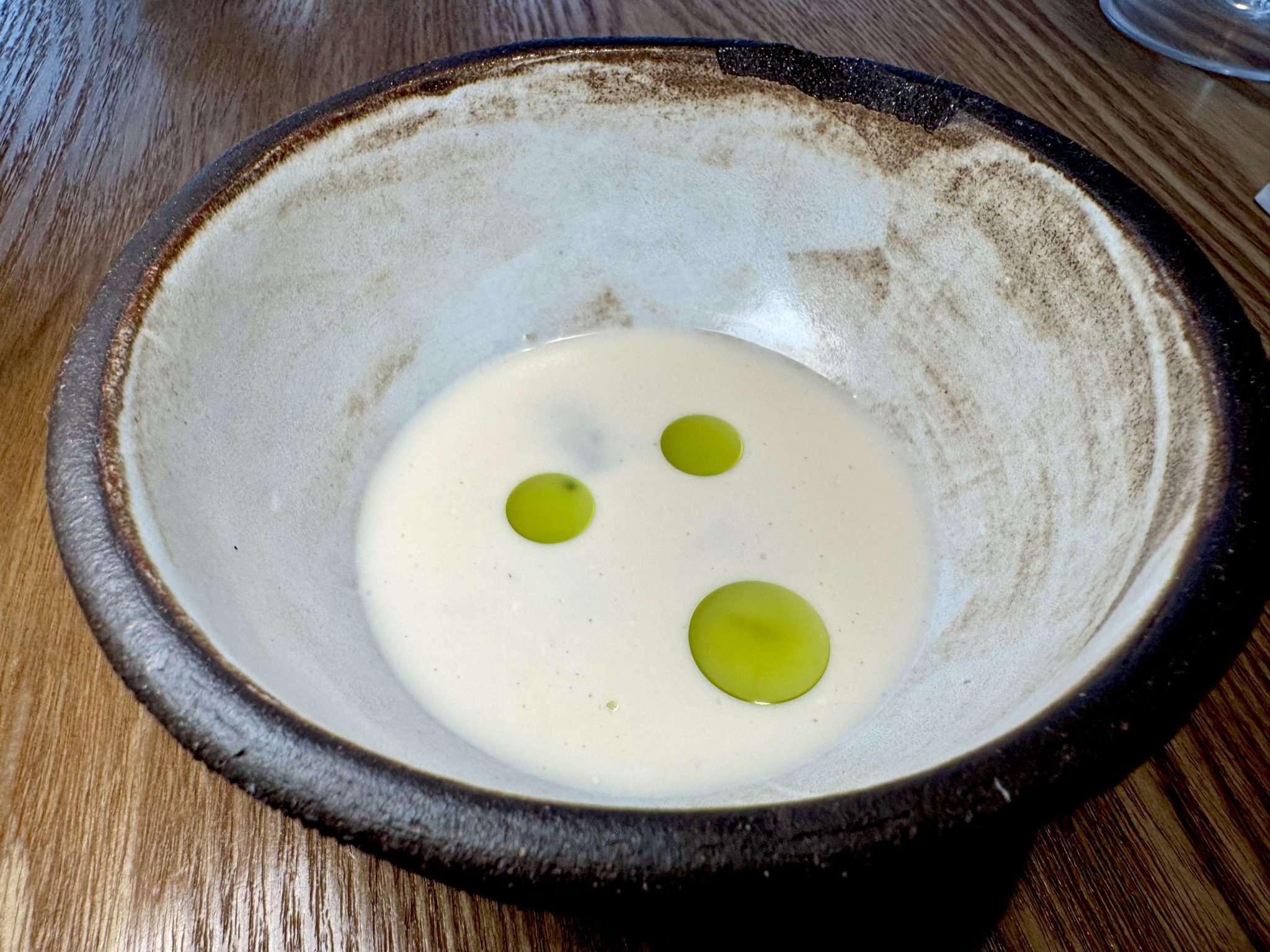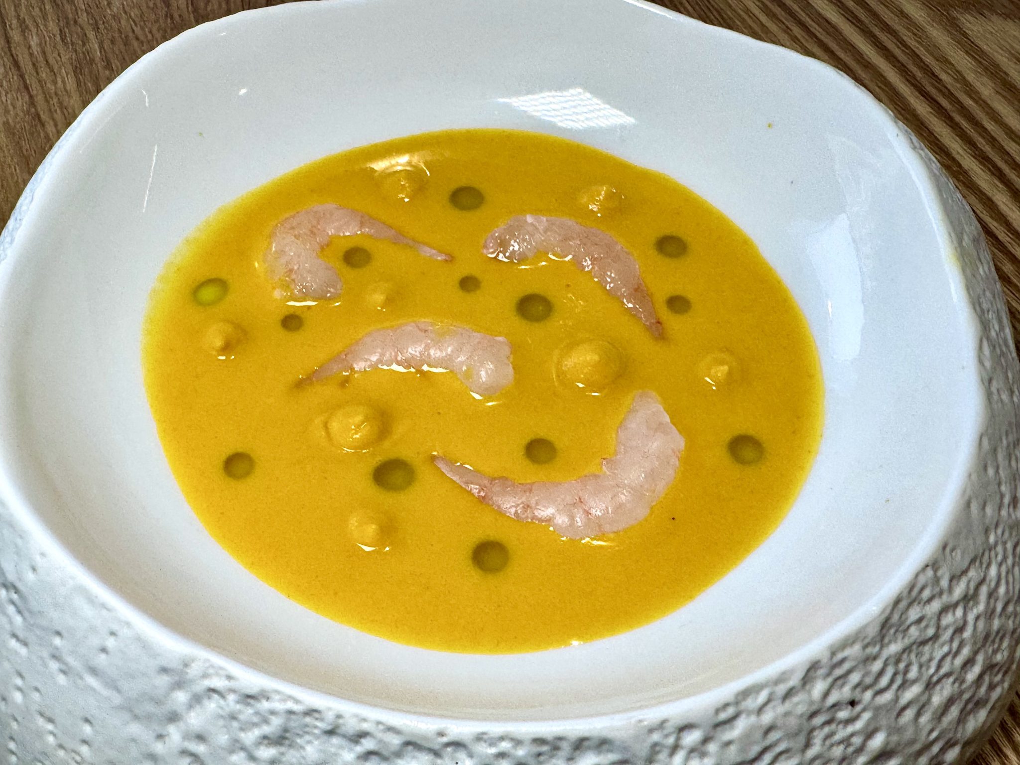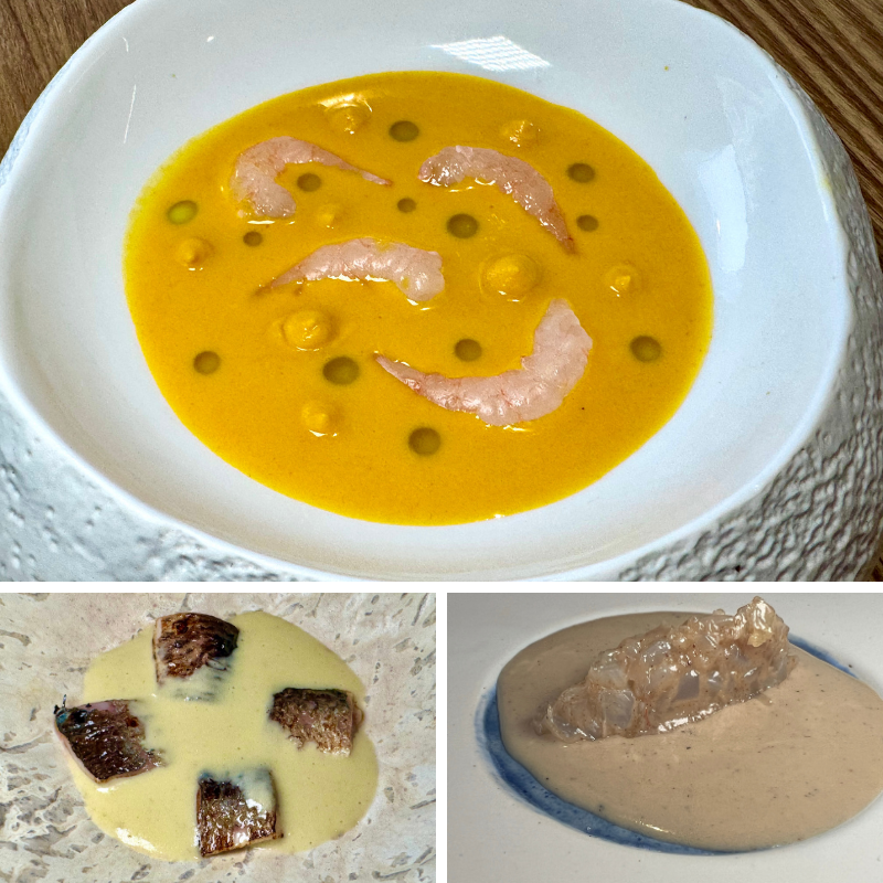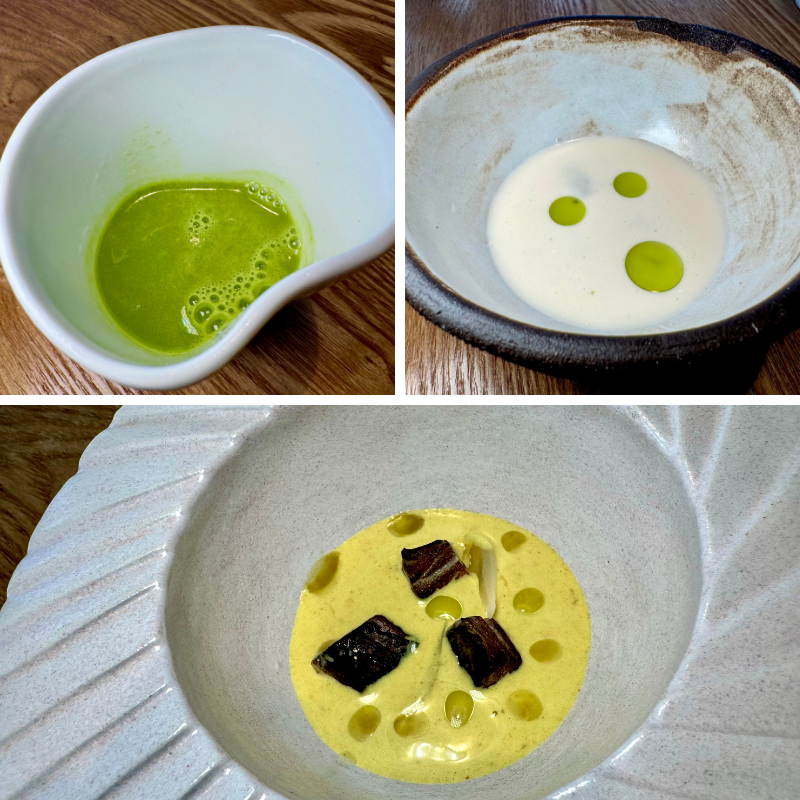 El aguadillo de lechuga con el que arranca el desfile, inspirado en los jornaleros del campo, no es otra cosa que un refrescante gazpacho de lechuga, de una simpleza que emociona. Mayor enjundia posee la sopa de boquerones sobre brandada de su piel convertida en una emulsión con los pescados en tropezones. Con los lomos de caballas asadas compone un gazpachuelo frio de caballas al que añade especias morunas, ras el hanut y harissa, propuesta que desconcierta por la temperatura fría de la sopa y la excesiva superposición de aromas ajenos a la receta clásica.