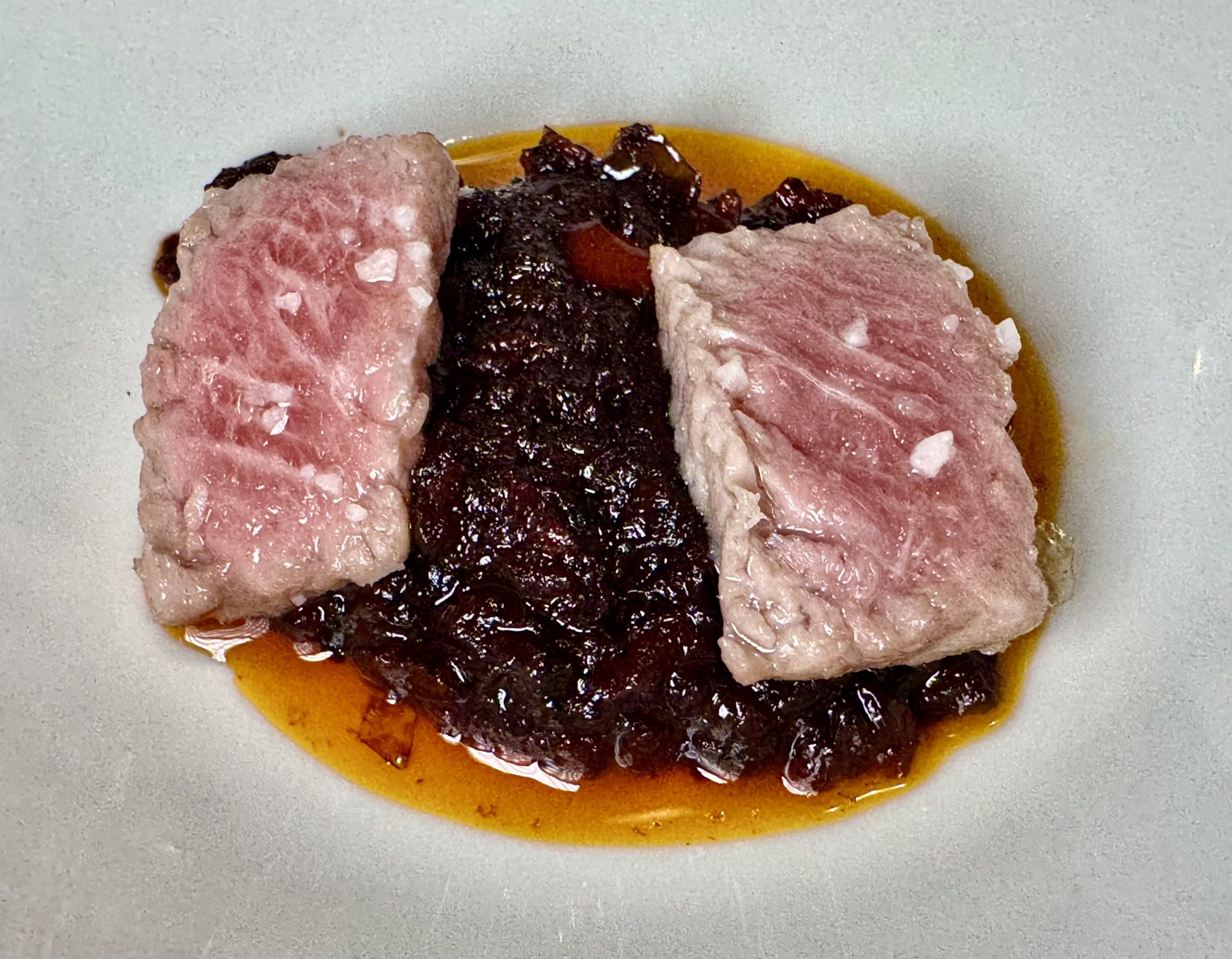 No menos relevante que el guiso de chocos en amarillo, típicamente marinero, que convierte en alta cocina. Preludio de la traca final, la salsa de tomate de la abuela Trini donde la ventresca de atún a la plancha se convierte en la guarnición de la salsa. “Rindo homenaje a mi abuela, es un plato vivo que me acompaña”.