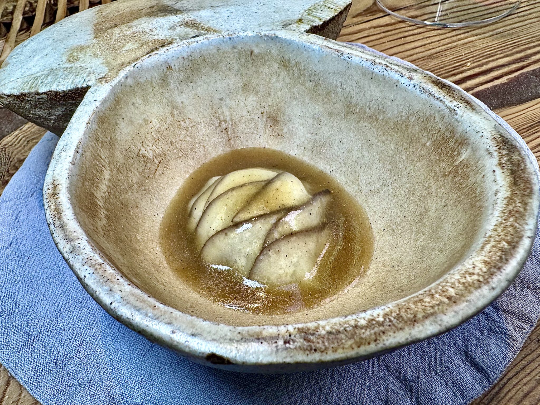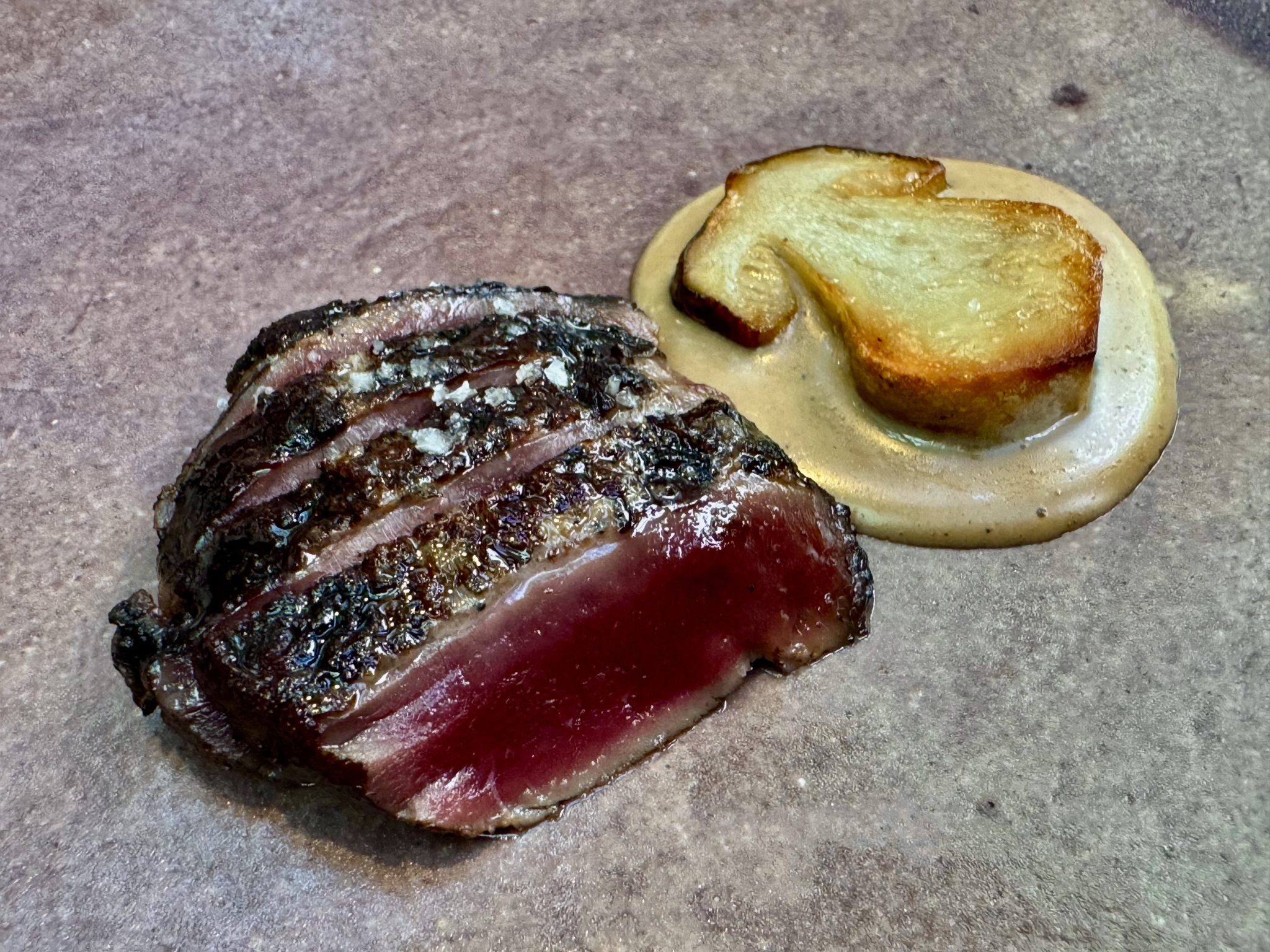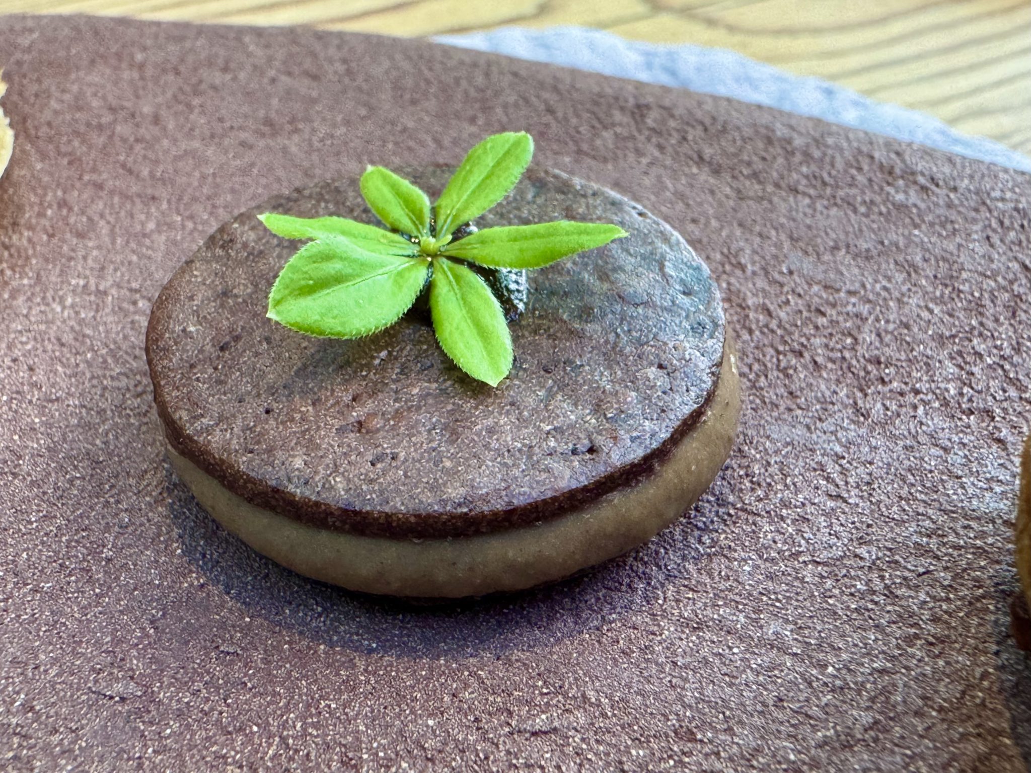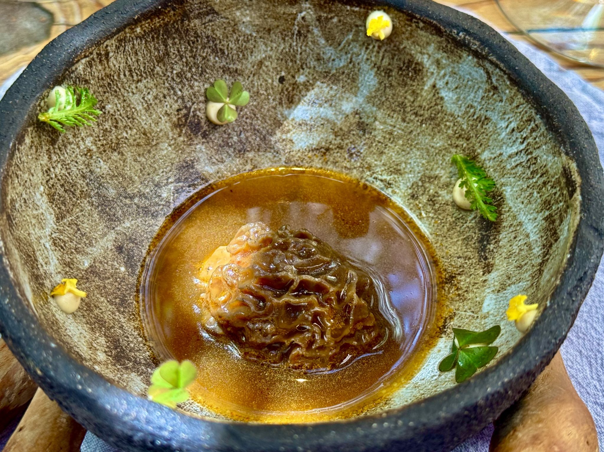 En el tramo final el cenit de la degustación lo ocupa la pechuga de paloma zurita curada con polvo de setas y una crema de boletus pinícola. De tal manera que el propio Ochoa irrumpe en la sala para explicar el vino Brutal Montia 2024 seleccionado para acompañarla. “Lo elaboramos en el restaurante. Pisamos la uva y la fermentamos en nuestra bodega. Más natural imposible. Procede de uvas garnacha y de un par de variedades de Zamora. Fermenta en tinajas de barro con algo de velo en flor. El sello Brutal, el mismo que emplean los elaboradores de vinos naturales cuando comercializan cuvées especiales, me ilusiona”. El desfile concluye con una tarrina de conejo y fuagrás cubierta por láminas de setas de cardo cultivadas en un local semi escondido de San Lorenzo de El Escorial próximo al restaurante. Lo insólito y lo inédito con una carga de sinceridad que emociona.
