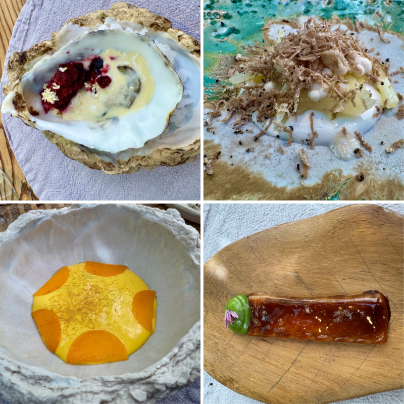 1.- Espárragos blancos, ajoblanco y trufa de verano. 2.- Ostra en escabeche de flores de saúco y granizado de cerezas. 3.- Crema de rebozuelos con azafrán y calabaza. 4. – Trucha confitada y wasabi