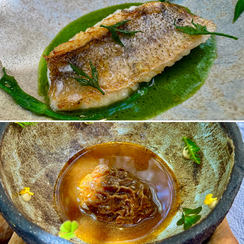 1.- Lomo de pescado de río. 2.- Colmenilla en caldo de caracoles
