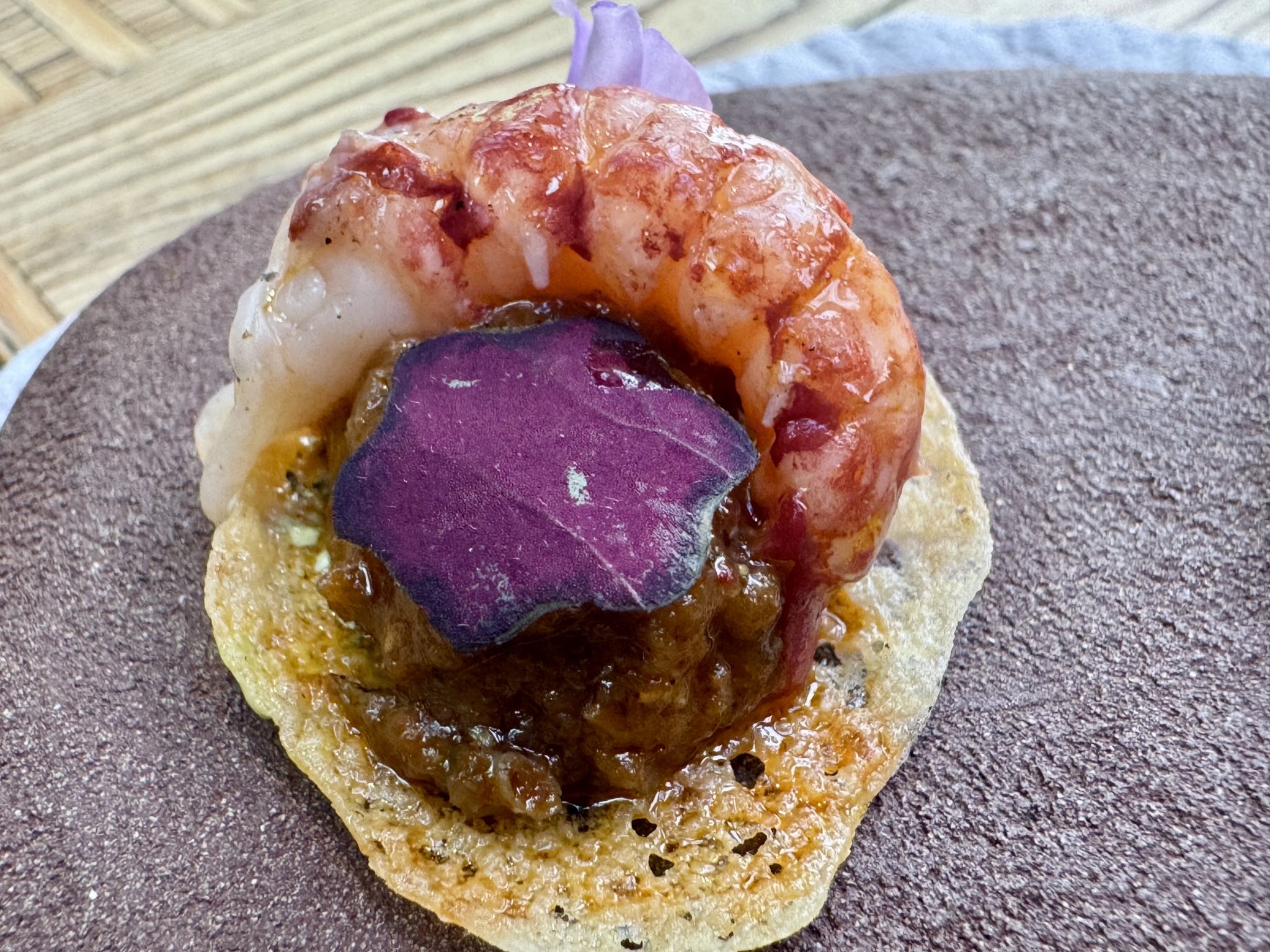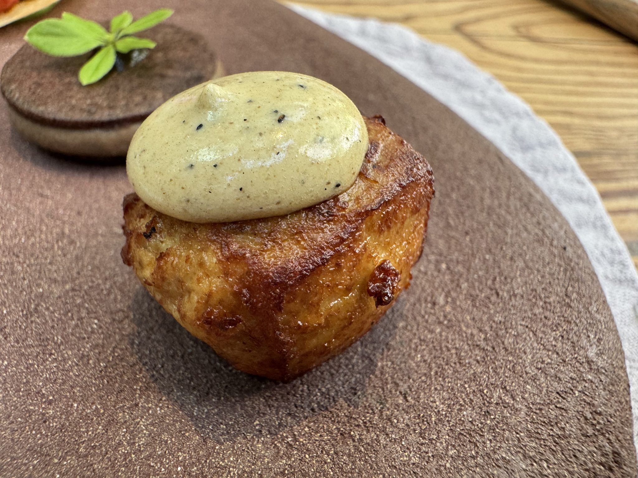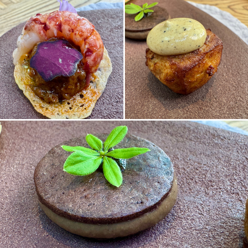 1.-Torta de cangrejo picante. 2.- Tortilla de chalotas con trufa de verano. 3.- Galleta de paté de paloma