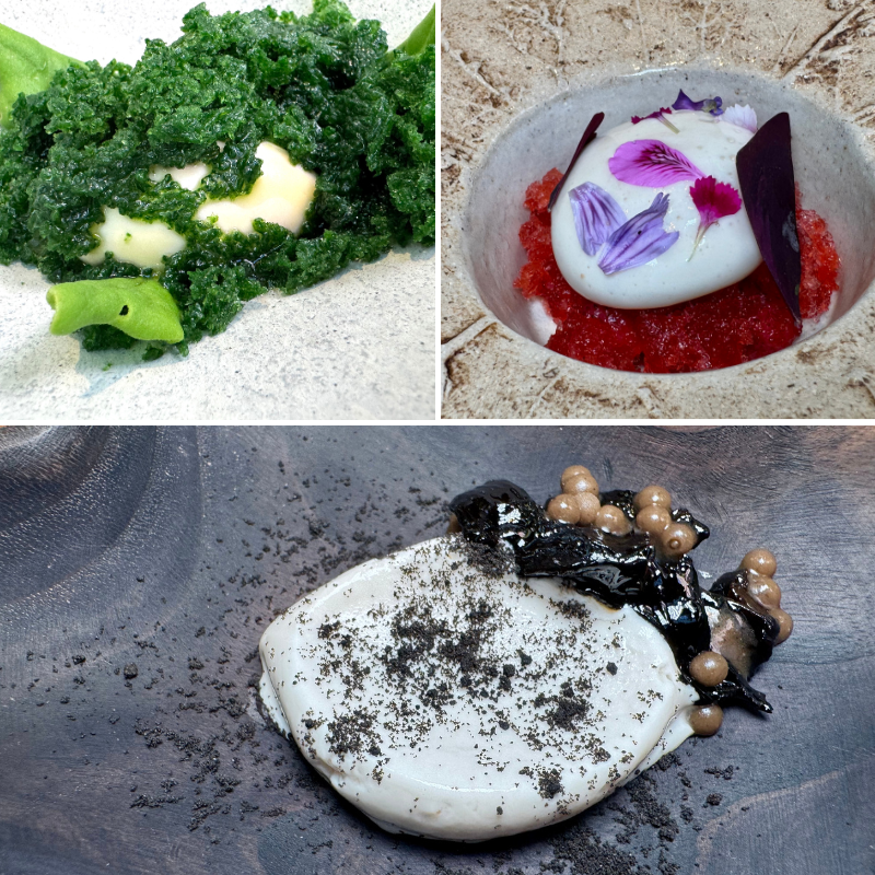 1. Helado de queso de cabra y granizado de espinacas. 2.- Merengue de almendras amargas, fresas. 3.- Trompeta negra guisada en pacharán