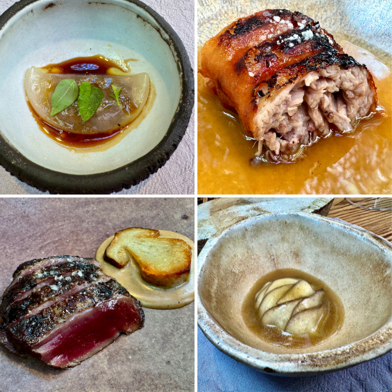 1.- Ravioli de asadurillas encebolladas. 2.- Faordero a la brasa. 3.- Paloma torcaz con boletus. 4.- Tarrina de conejo, fuagrás y setas