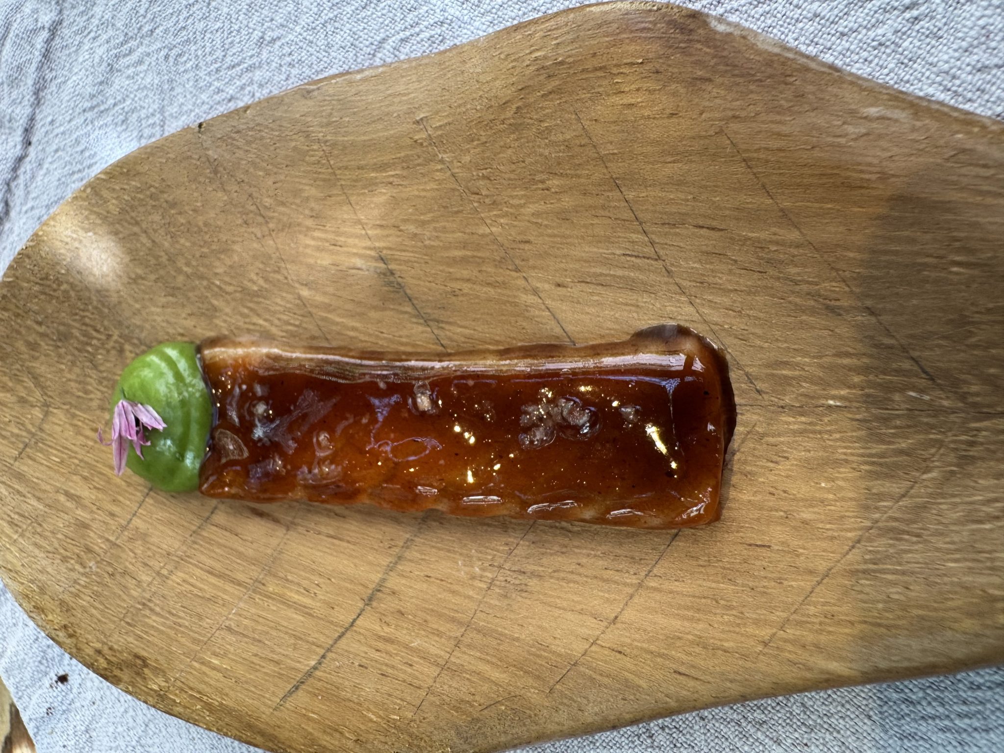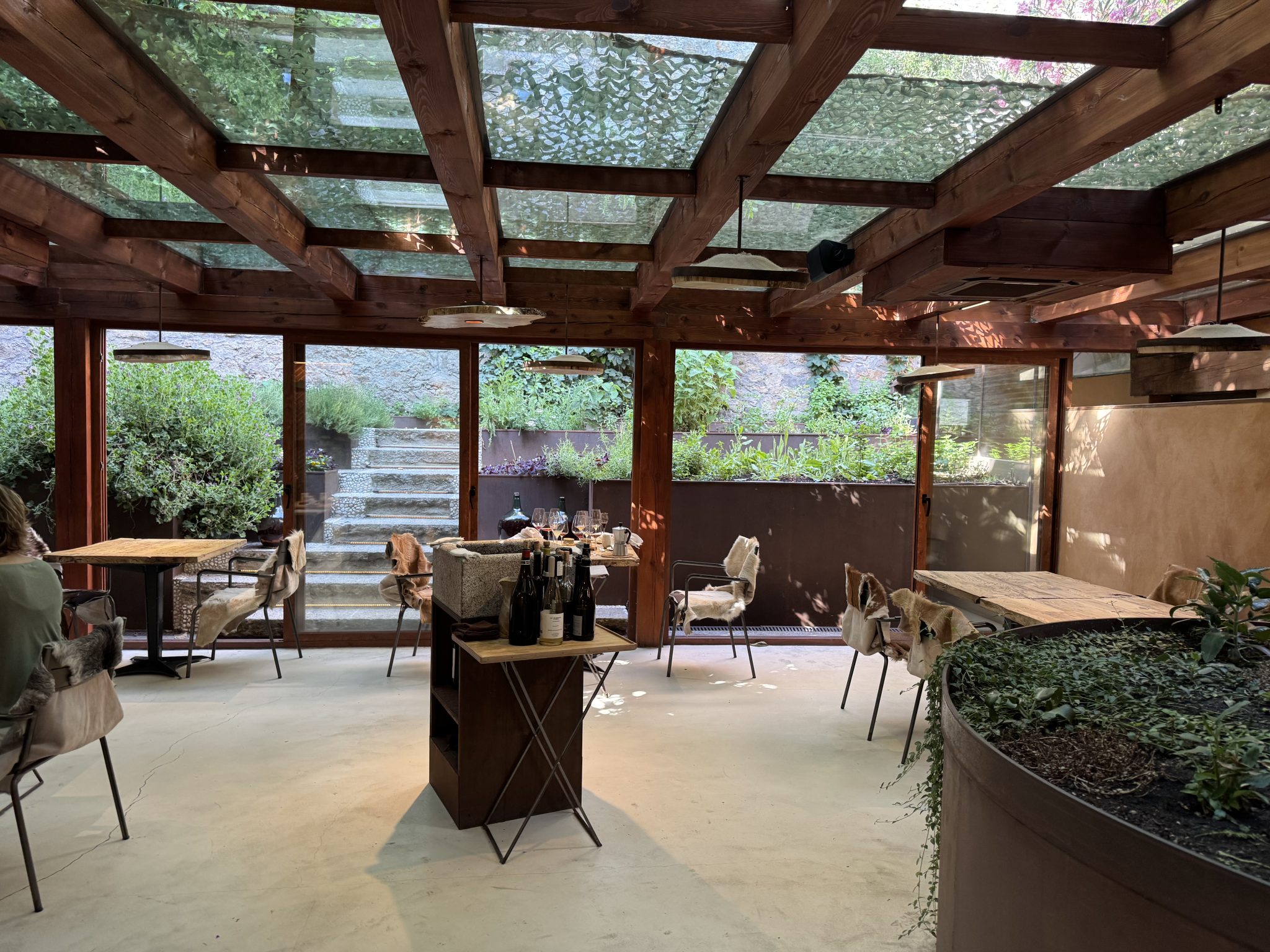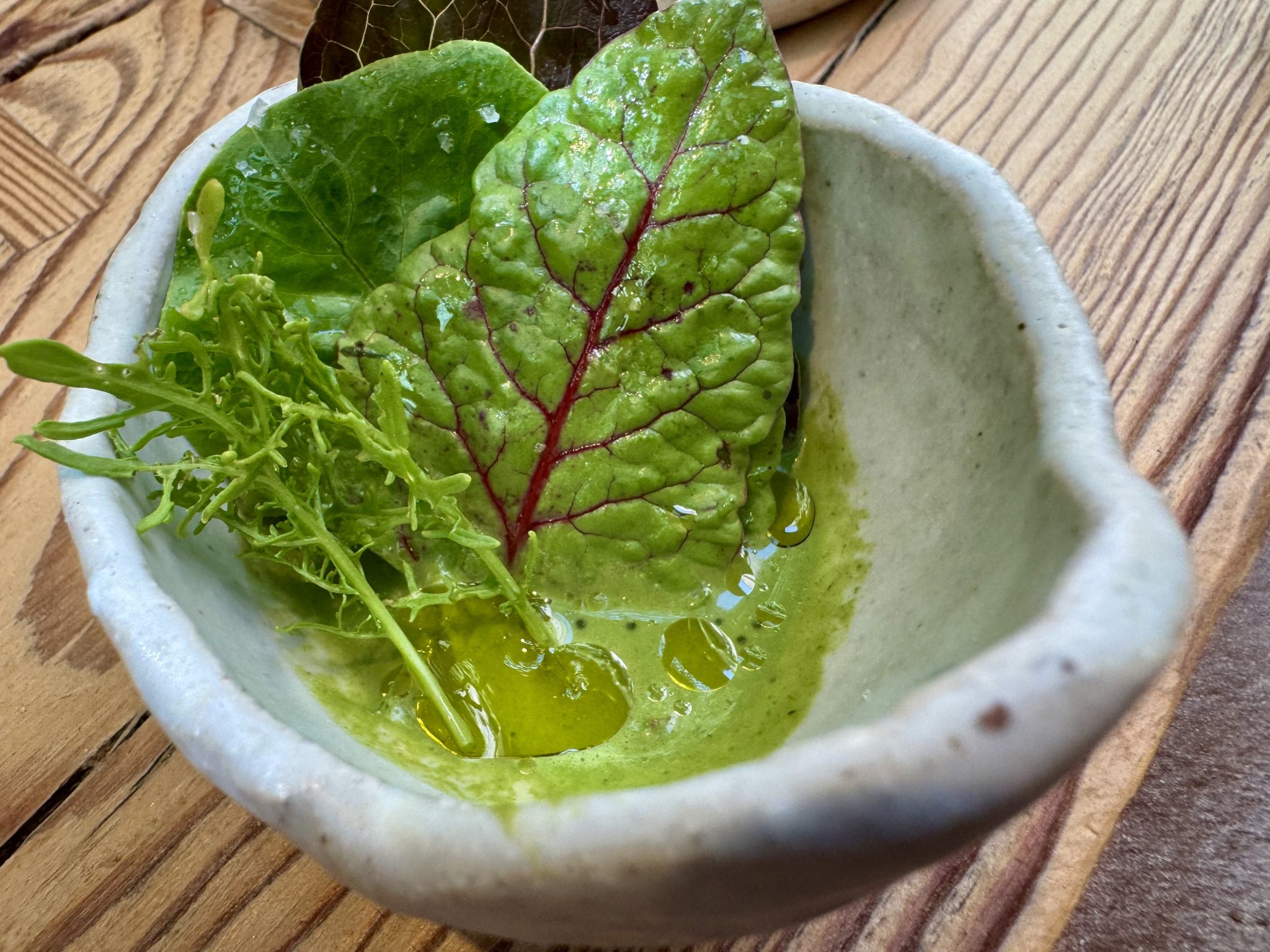 Propuestas que rezuman compromiso con la naturaleza y los vinos naturales a partes iguales. Dúos que obligan a reflexionar en torno a armonías inéditas. Tan expresivo como el ravioli de asadurillas encebolladas con aceite de pino, resulta la falda de cordero lechal de Colmenar Viejo a la brasa con ensalada líquida de hierbas aromáticas.