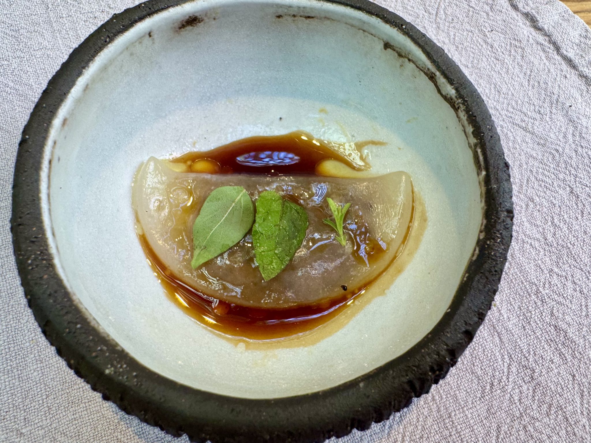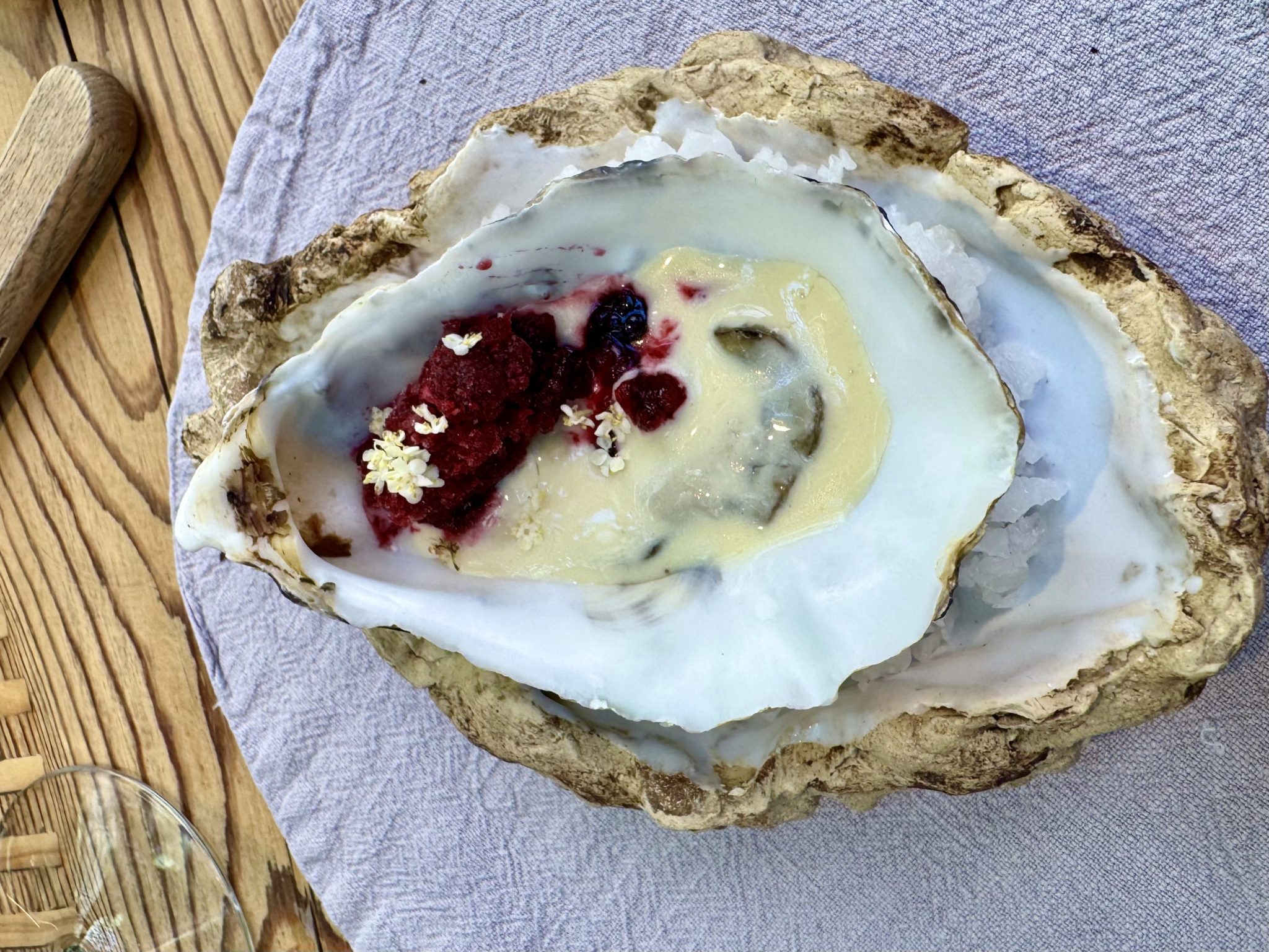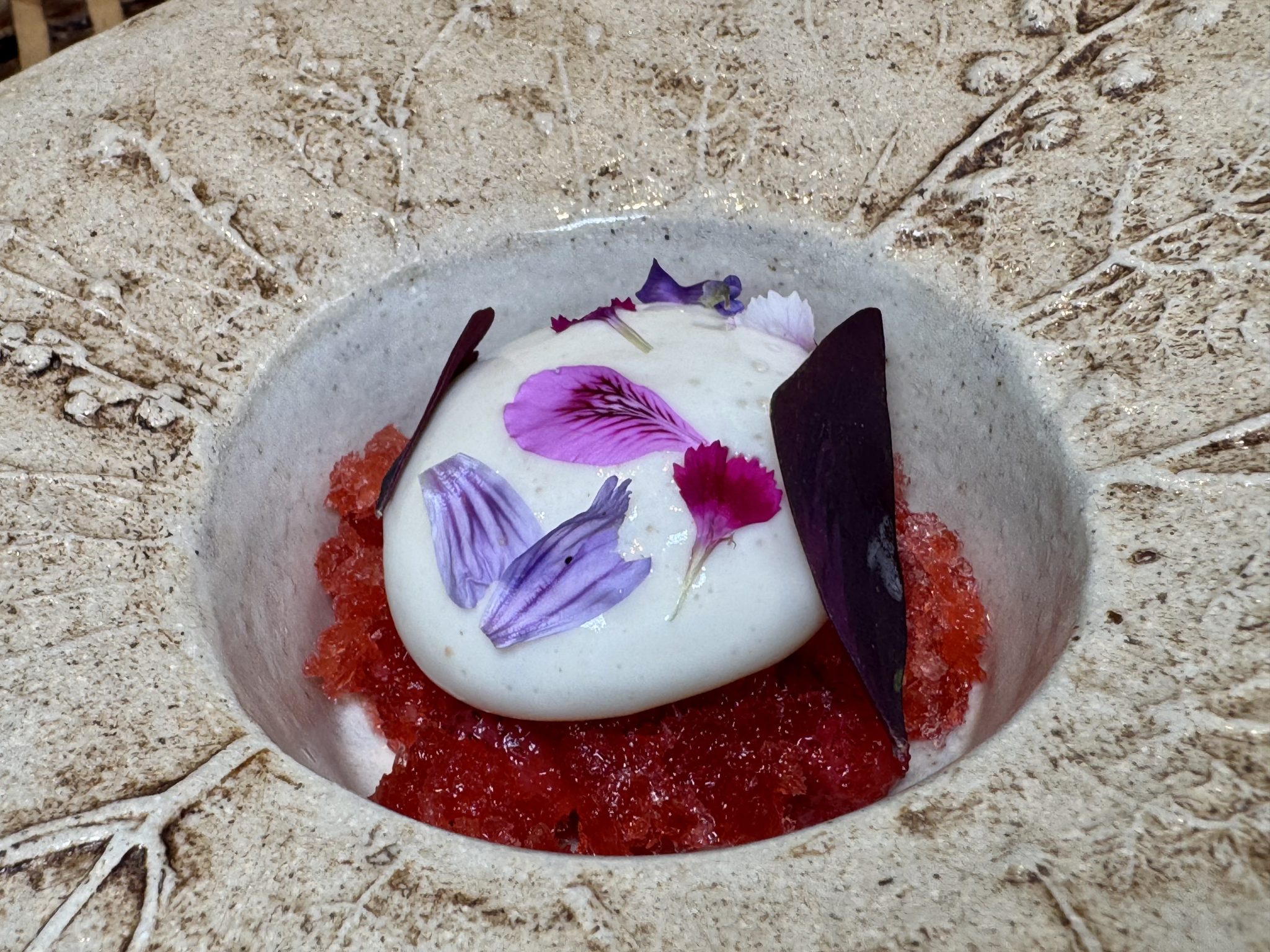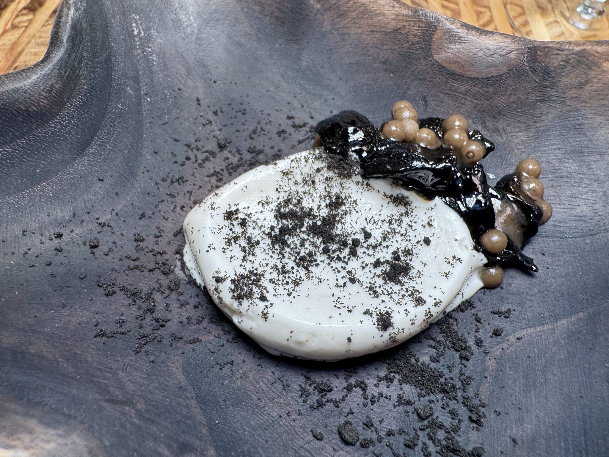 Tras los mini aperitivos -torta de cangrejo picante; galleta de paté de paloma, y tortilla de chalotas con trufa de verano- que realza con un aromático vermú casero, irrumpe la primera de sus arriesgadas armonías. Un vino natural -Dorée 2018, de Hoyo de Pinares (Ávila)-, con aromas al líquido de gobierno de las latas de espárragos. Raro, defectuoso, pero excelente en compañía de la emulsión de espárragos blancos, con ajoblanco y trufa de verano. Binomio experimental que anticipa lo que sigue. Primero la ostra en un escabeche de flores de saúco y granizado de cerezas en compañía de un vino ácido de uvas verdejo -“Evolución 2012”-, de la bodega Microbio Wines de Segovia.