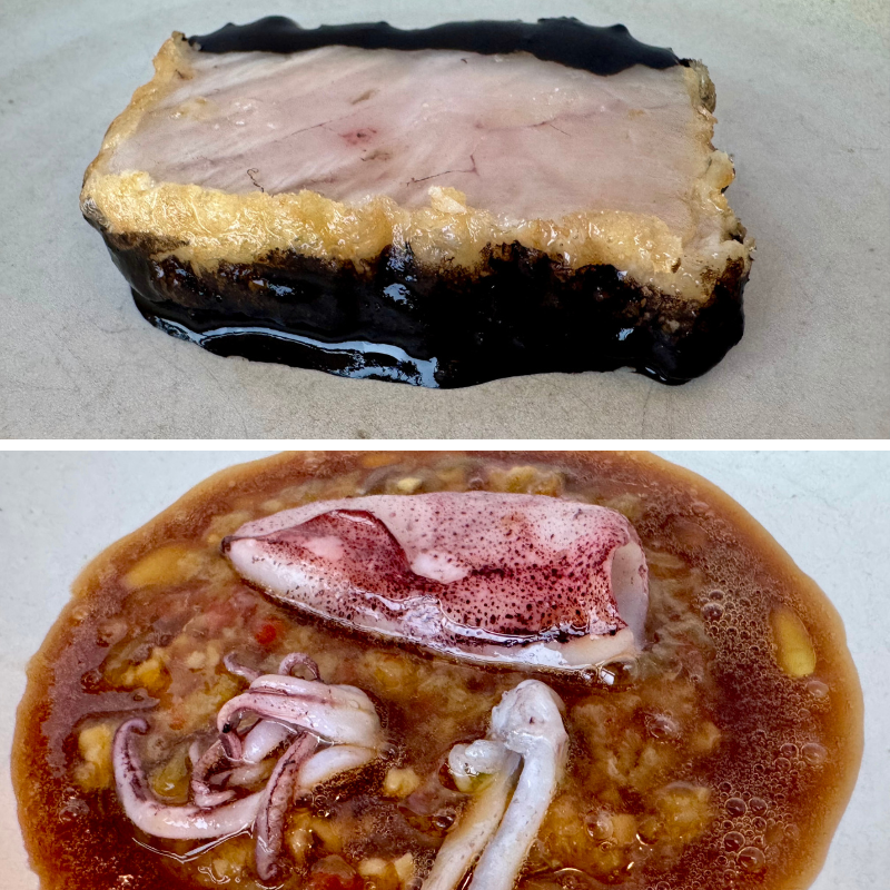 1.- Bonito albardado con salsa negra. 2.- Chipirón sobre zurrukutuna