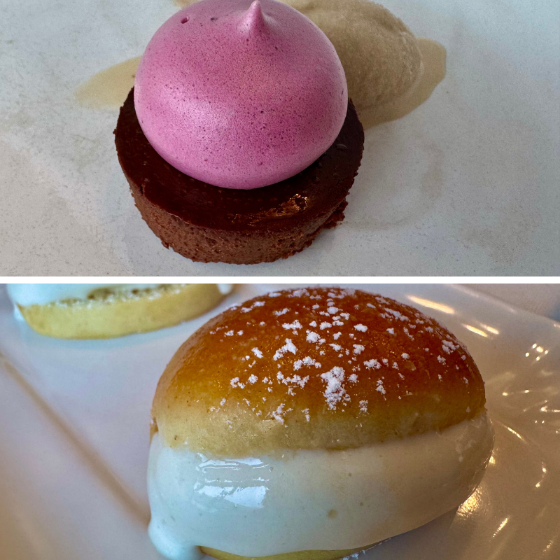 Resulta delicadamente fina su versión del mejillón tigre con salsa de tomate picante, de una textura que arrebata, bocado revisado de bares y tabernas; suculento el símil de arroz con bogavante hembra picado en brunoise que simula un fondo de arroz sobre el que descansa el taco del crustáceo; sensacional la ventresca de bonito albardada sobre salsa negra en recuerdo de los chipirones; delicadísimo el chipirón de anzuelo sobre una zurrukutuna de pan (sopako) con ajo y caldo de chipirón, y sorprendente la lengua de cordero sobre una etérea crema de garbanzos.