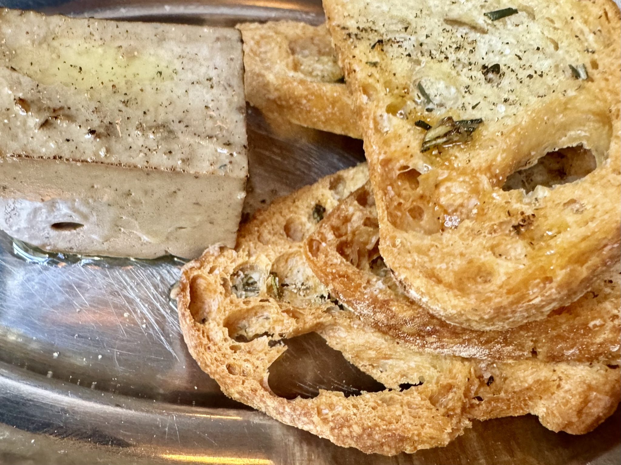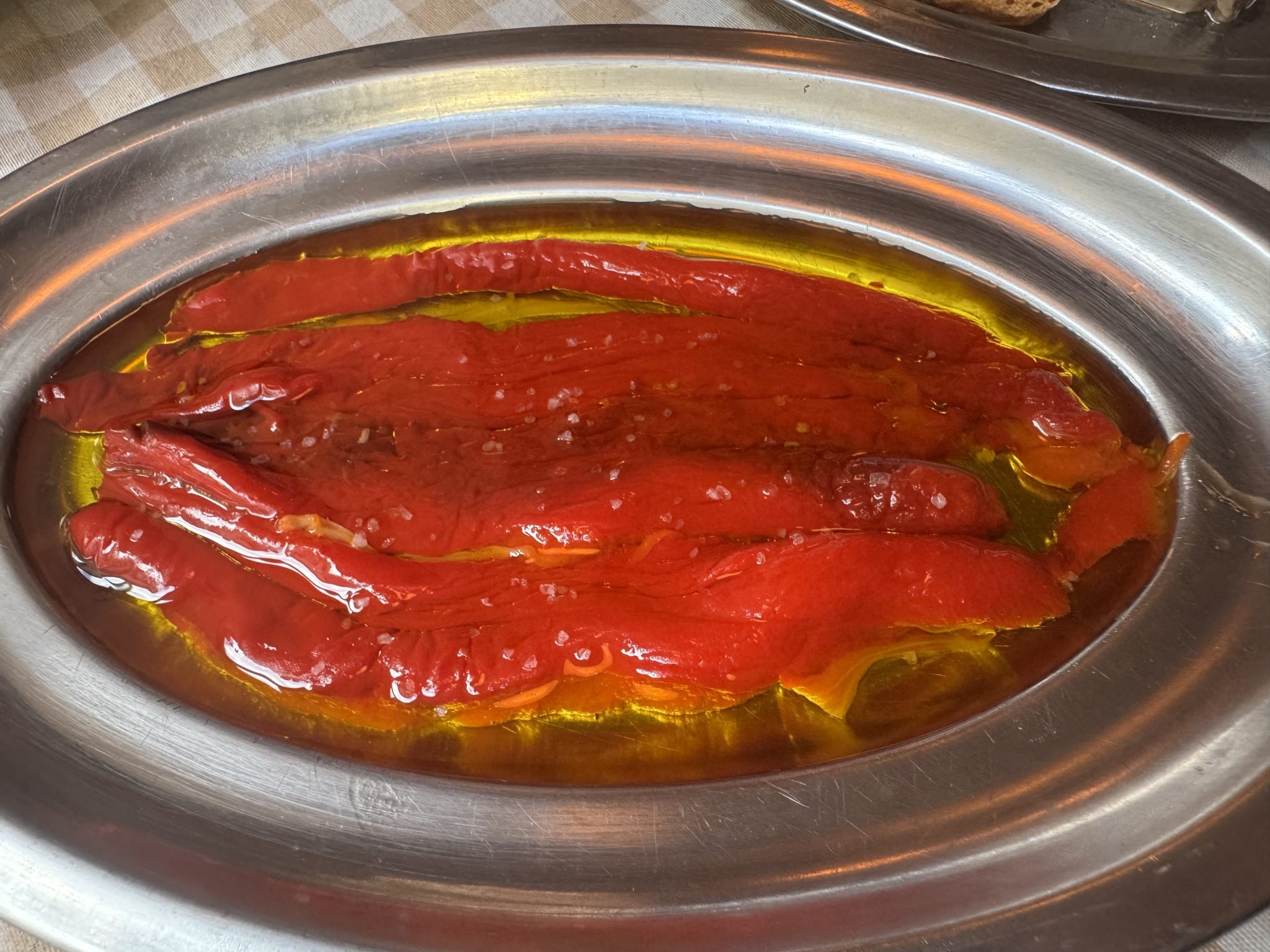 Cuando llegan a la mesa las lentejas pardinas guisadas en sopera, absolutamente excelsas, Narciso prosigue con su relato. “Proceden de Castroverde de Campos, el pueblo del cocinero Luis Lera; el chorizo, el magro y la panceta son de la Carnicería Manolo del Alto Órbigo (León). Mis proveedores sustentan el alma de mi cocina, me cuesta mucho trabajo conseguirlos”. Al comienzo, para abrir boca habían aparecido dos aperitivos en bandejas de aluminio, pimientos Lamuyo rojos asados, pelados y aliñados, excelentes, aunque de nuevo rociados con exceso de aceite, y un sabroso paté de higaditos de pollo con pan tostado.