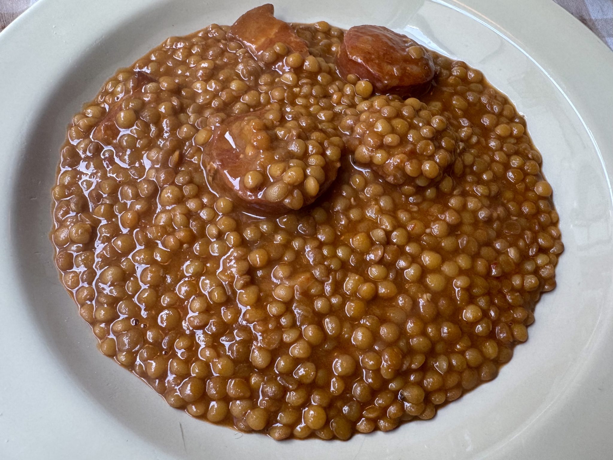 1.- Lentejas pardinas. 2.- Paté de higaditos de pollo con pan tostado. 3- Pimientos Lamuyo rojos asados.