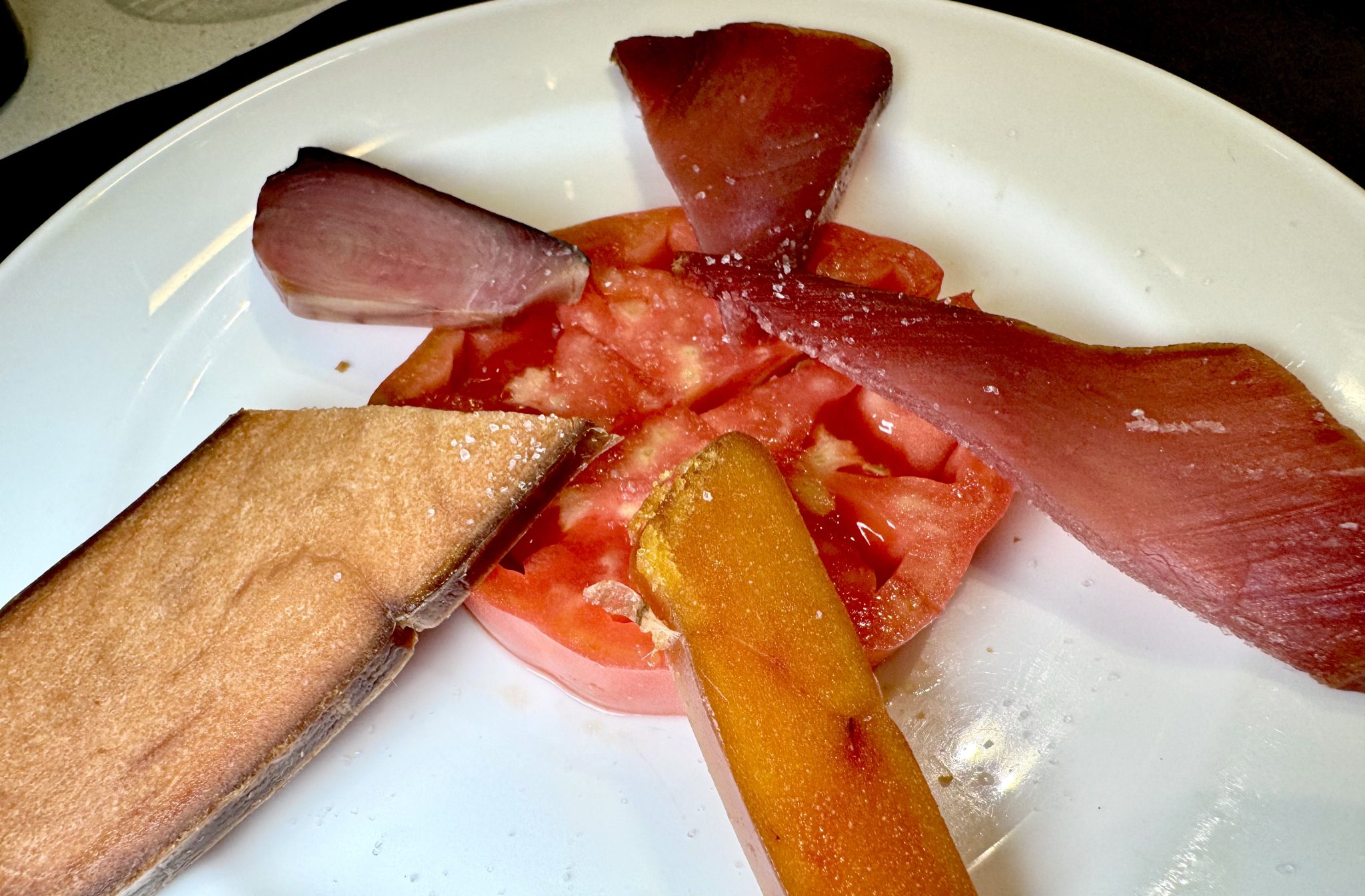 Resultan magníficas las chacinas, desde el jamón ibérico a la caña de lomo, cortadas al momento. Lo mismo que sus salazones (mojama, huevas de mújol y de atún) en compañía de lascas de tomate. No menos relevantes que las anchoas López, serie oro, de Rafa López, curadas en Valencia gracias al empeño de un artesano local.