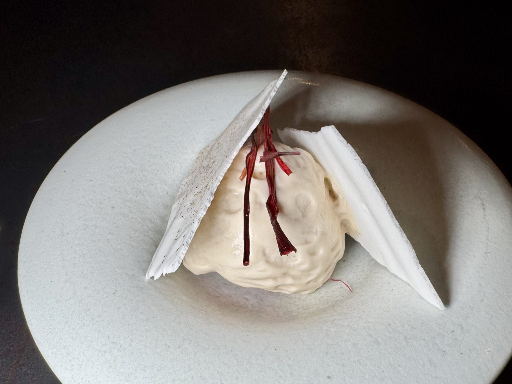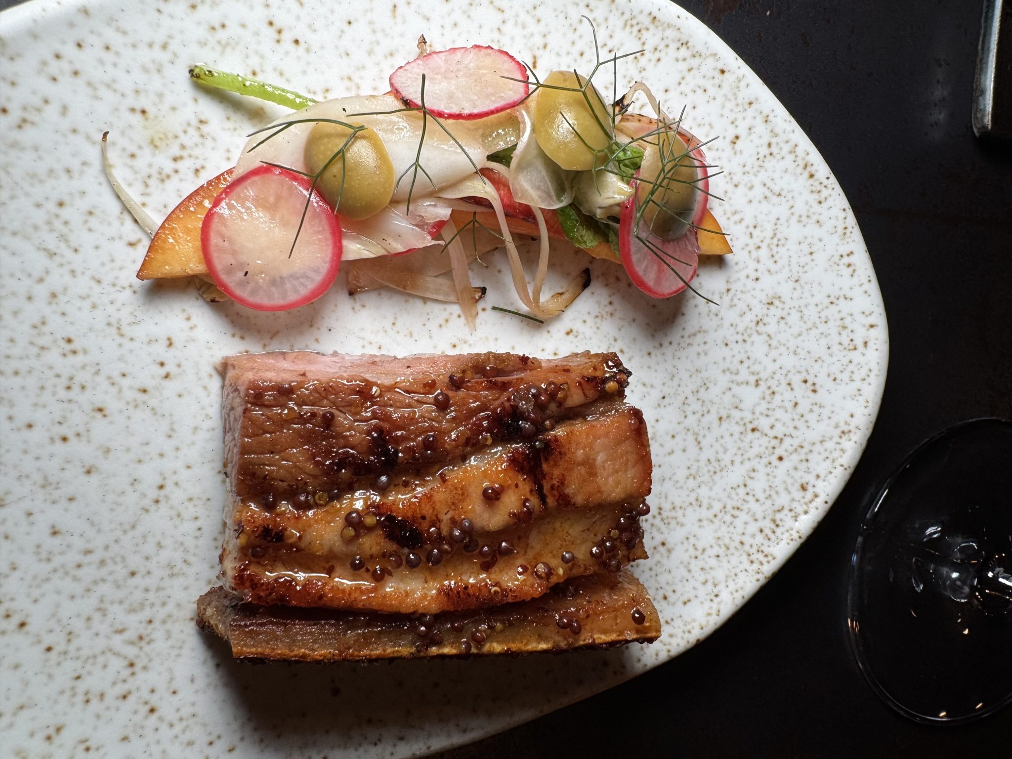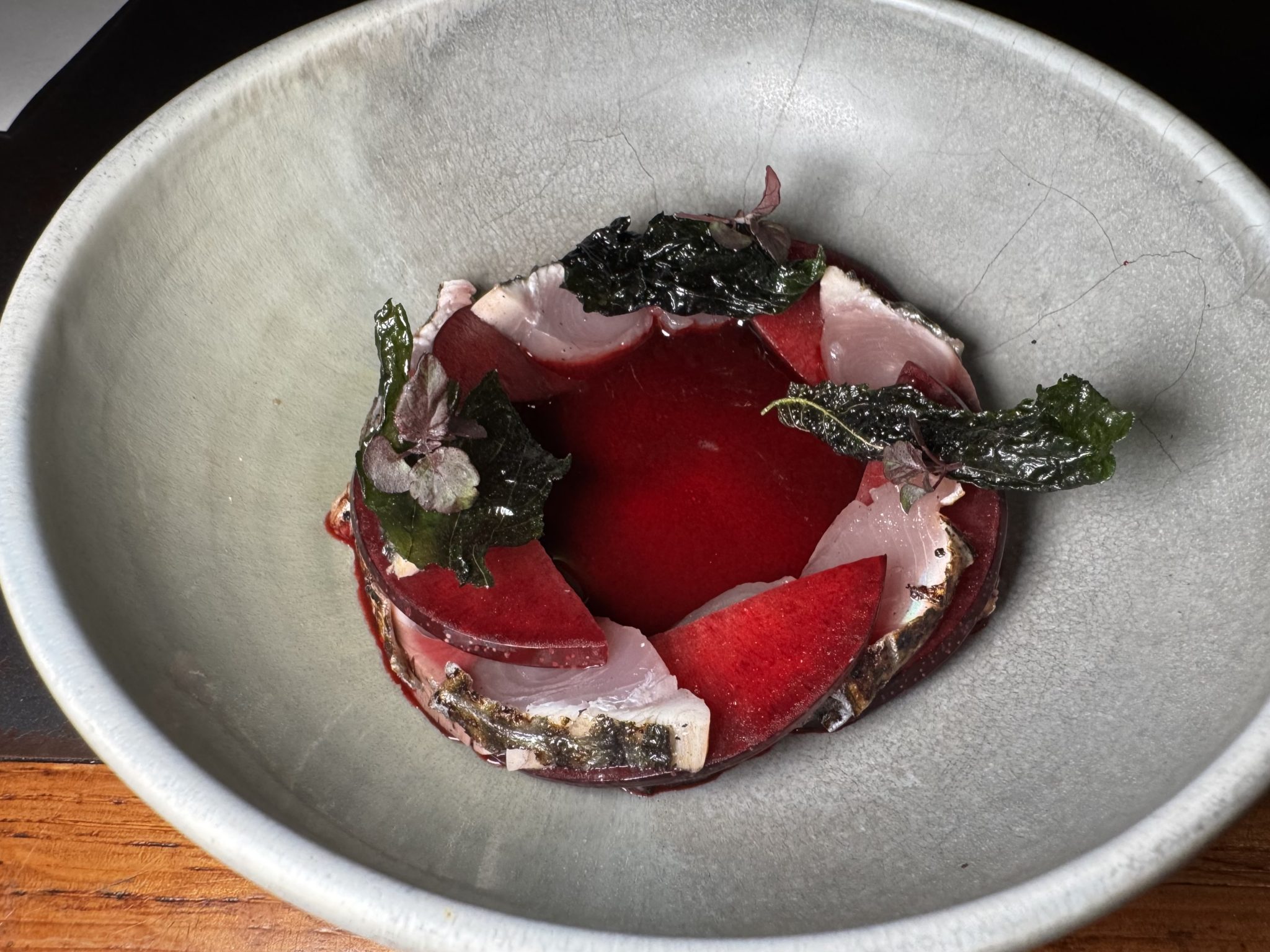 A las lascas de caballa en tataki con rodajas de ciruela australiana, hojas de sisho y jugo de remolacha, composición particularmente yodada, siguió la ensalada de flores de calabacín a la brasa, con huevas de trucha, suero de leche ahumada, alforfón y miel, de notas vegetales y dulzonas. Dos pases ligeros antes de ahondar en la proteína animal que aguardaba agazapada.