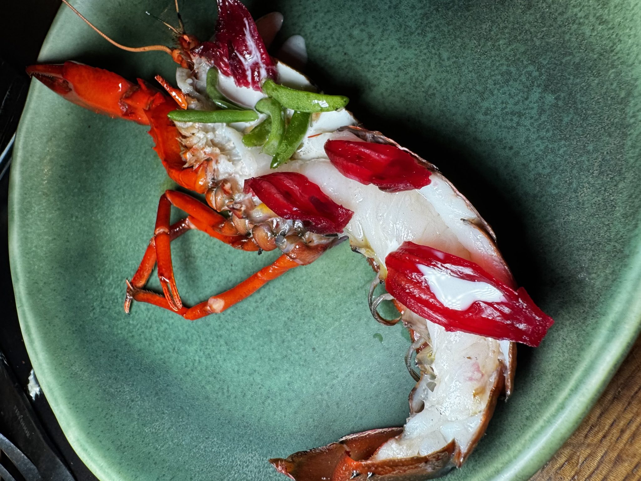 Enseguida, un cangrejo gigante de la costa oeste australiana cocinado por el costado de la cáscara a la unilateral y rociado por un aceite cítrico y flores silvestres de rosella australiana. Magnífico. Y poco después, un pescado de anzuelo de la Gran Barrera de Coral, capturado frente a la costa de Queensland por la empresa familiar Chris Bolton Fishing algo equivalente a Artesans da Pesca en Galicia. Una suerte de besugo (espárido) sometido al método de ikejime japonés, de lomo jugoso que llegó acompañado de pimiento rojos, alcaparras y un pilpil del propio pescado. De nuevo excelente.