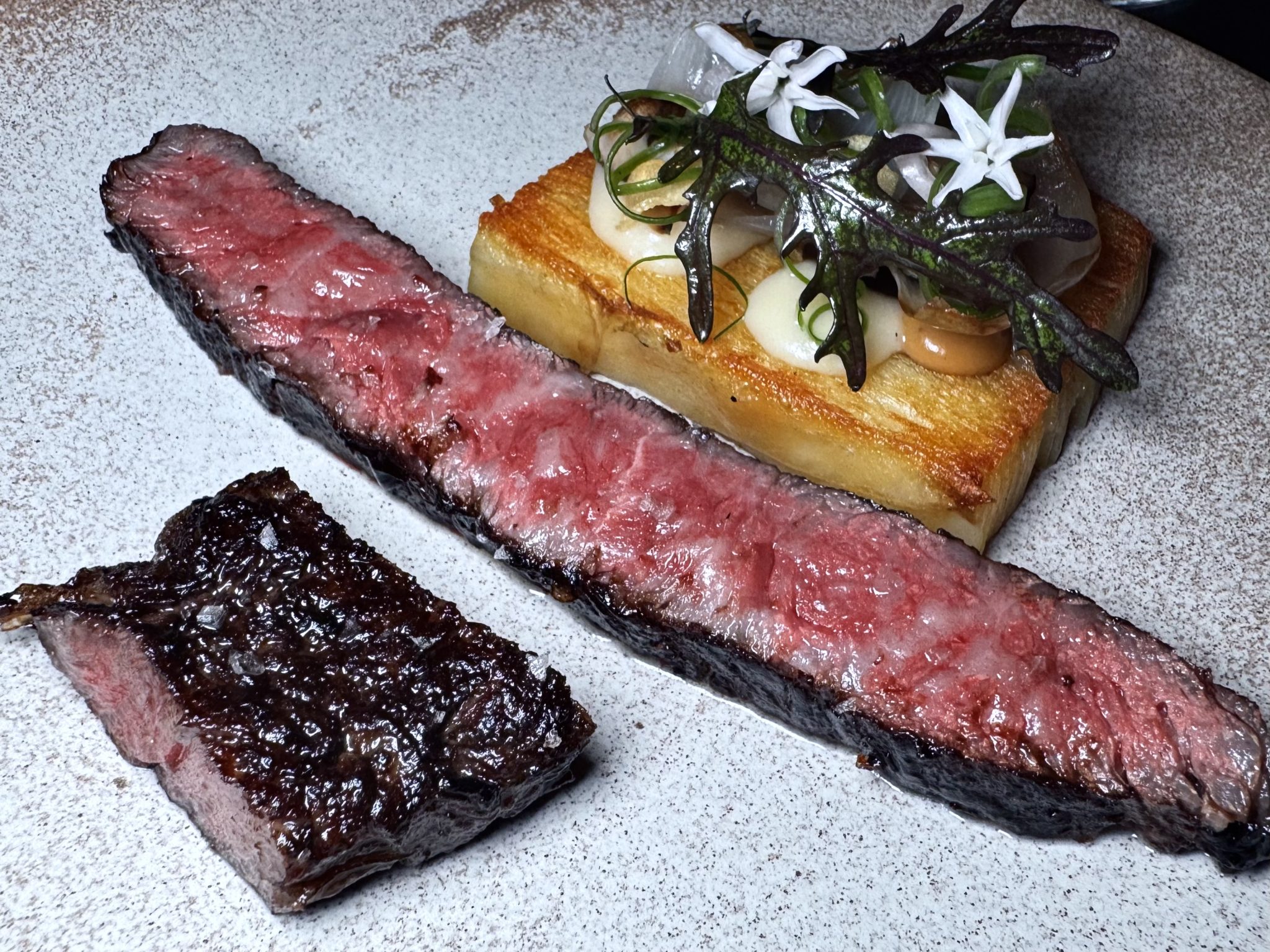 Y para concluir un entrecó de lomo bajo de wagyu australiano proveniente de la granja Westholme Nature-led Australian Wagyu, explotación que presume de gestionar 16 millones de acres de pastizales al norte del continente. Jugoso y sonrosado al corte, espléndido en compañía de un milhojas de patatas asadas a la leña y crema de ajo negro. Balance notable al que puso nota final un granizado de maracuyá, con mango y mano de buda, que precedió a la crema de ruibarbo y fresas.