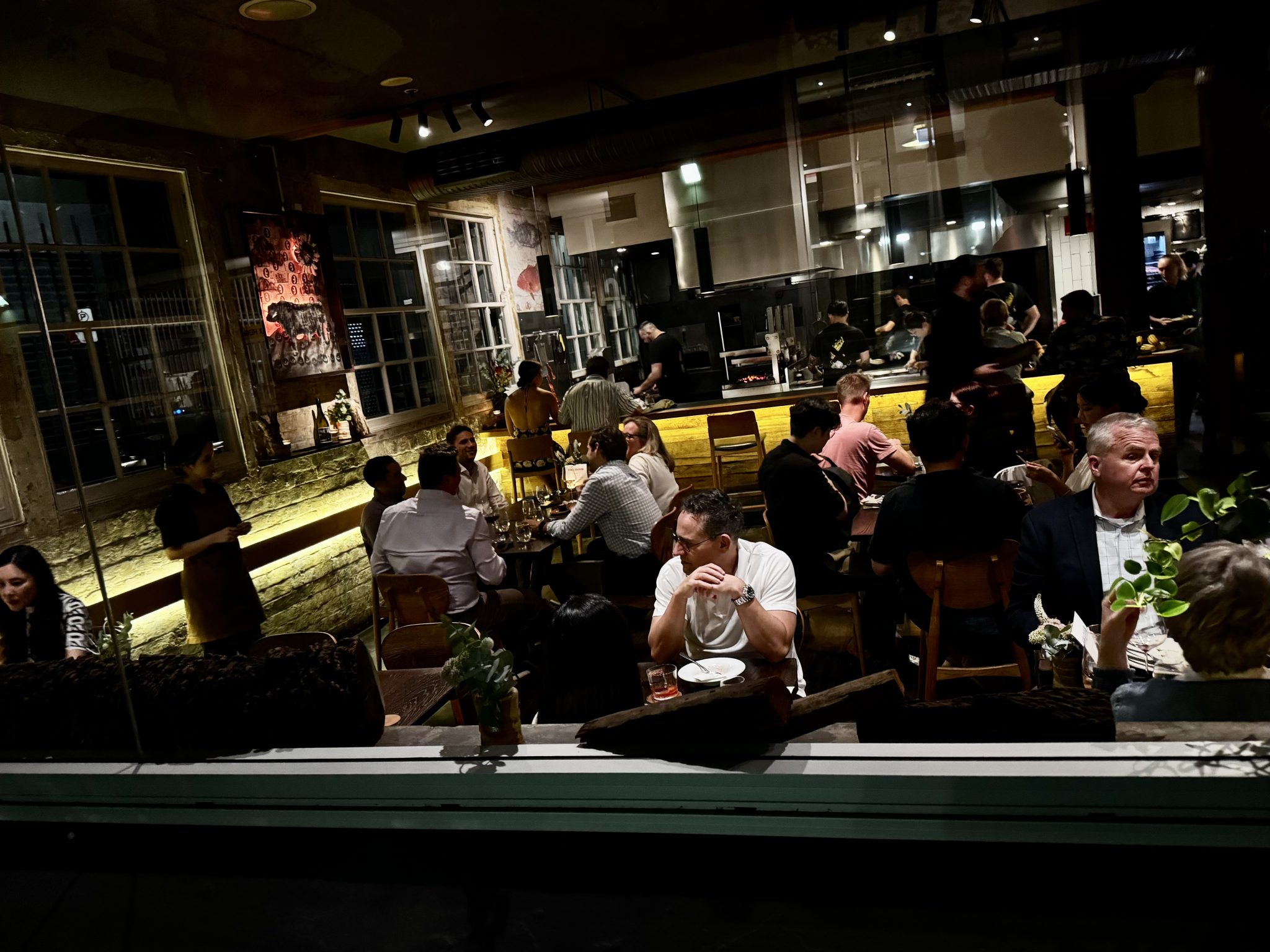 En un escenario abierto a la sala, repleto de parrillas y rincones del que fluyen continuas llamaradas, los comensales contemplan las evoluciones de un equipo joven que, bajo las directrices de Shane Hennessy, jefe de cocina, demuestran su oficio con los productos australianos.