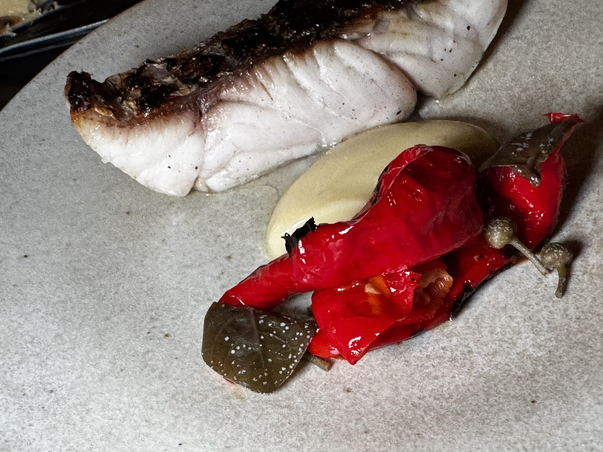Degustación que fue cobrando otra dimensión con las aclaraciones del cocinero gallego Mario Varela, parte esencial de la brigada de la casa, que me puntualizaba de forma breve las características de cada plato. “Tostamos el lomo de cerdo al calor suave durante largo tiempo, lo dejamos reposar y lo barnizamos con una salsa de miel y mostaza. A modo de guarnición, melocotón, hinojo y encurtidos. Proviene de Bundarra una granja familiar especializada en la crianza en libertad de cerdos de raza berkshire”, me comentó de corrido. En el plato una carne tierna, de sabor intenso y final de boca limpio, tratada de manera impecable.
