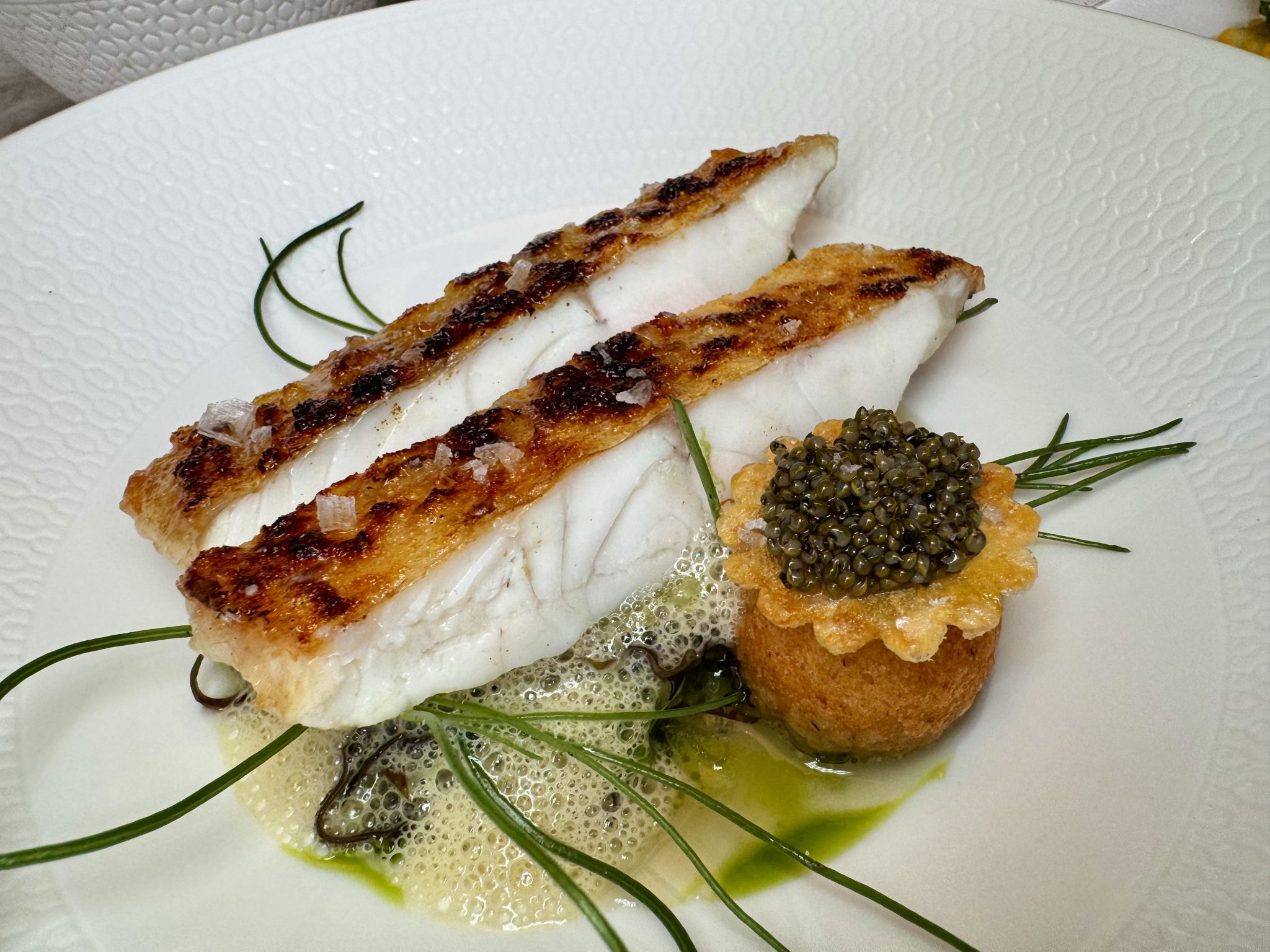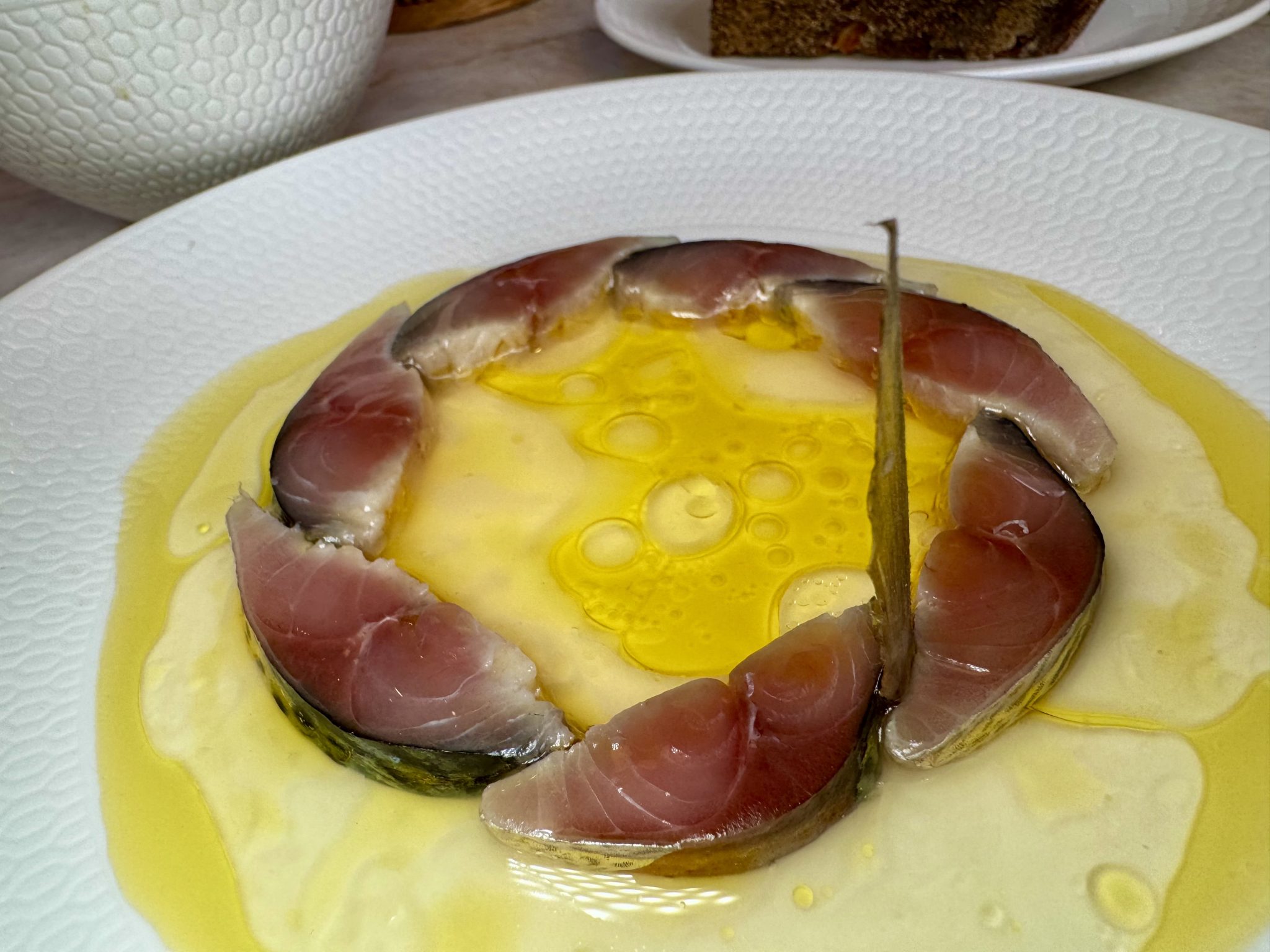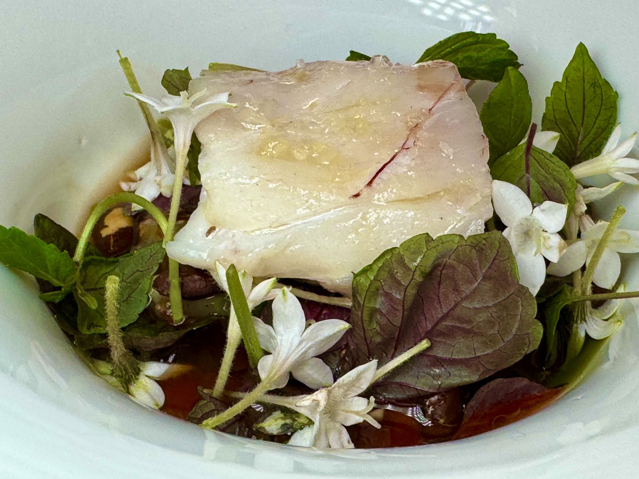 Los lomos de la propia trucha de coral los sirve más tarde asados con una jugosidad que emociona. Entre medias una caballa en lascas crudas en un símil de vinagreta al jugo de aceitunas gordales receta inspirada en los boquerones en vinagre que probó en un bar de Madrid, según confiesa. Y en seguida una perca perla, capturada con sedal, acompañada con pepinillos y ponzu de higos negros, un suave ejercicio de contrastes entre las notas yodadas y dulzonas del pescado y la fruta. Bocados que sirven de pretexto de su filosofía culinaria.