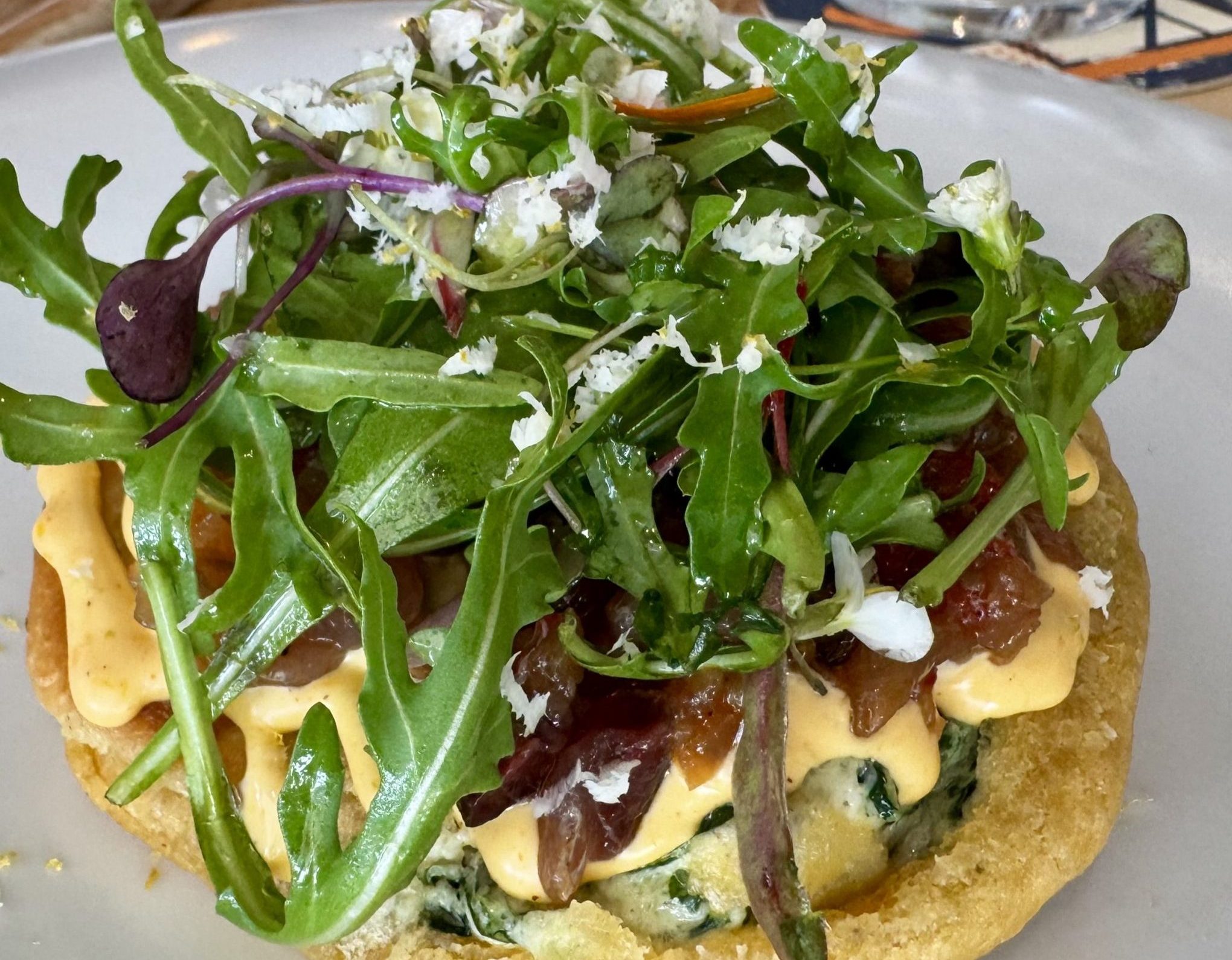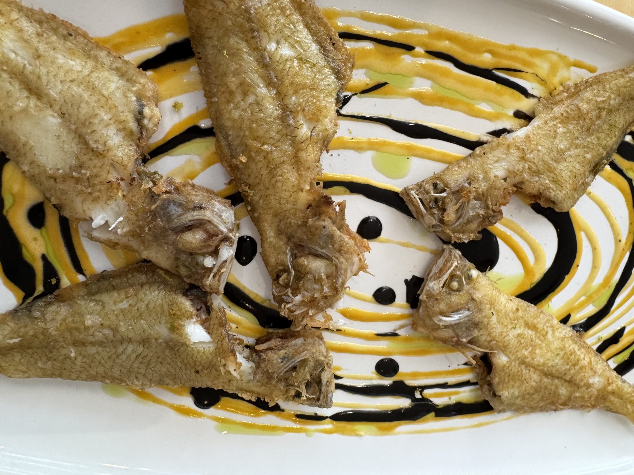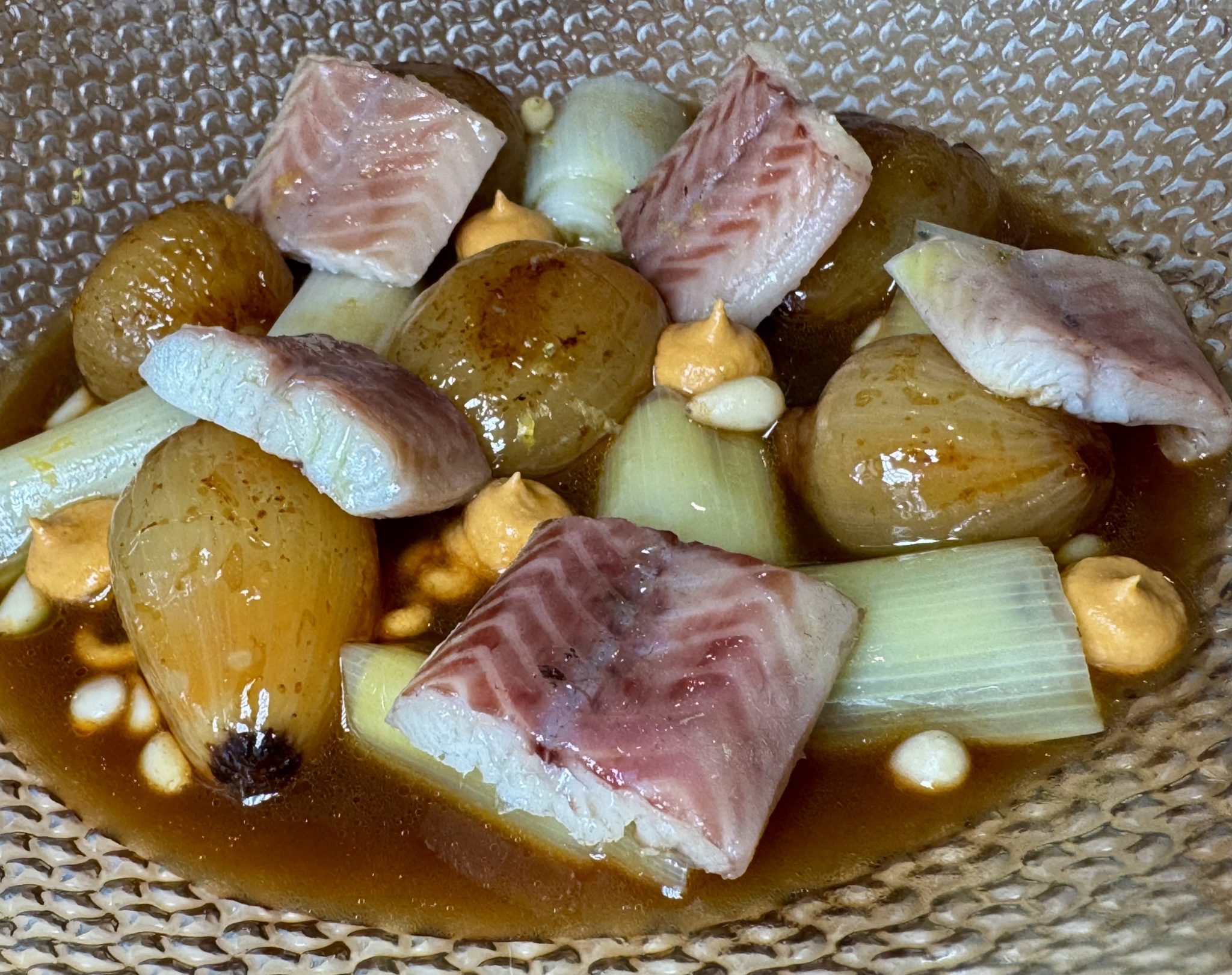 Están muy conseguidas la coca a la paleta con manteca colorá, col china fermentada y bonito en semi salazón; agradables los llamados “escarfolls”, calçots, con cebolletas confitadas y anguila ahumada; soberbios los guisantes en un suave escabeche con quisquillas, y menos convincente la fritura de acedías sobre hilos de pilpiles y varios adobos que modifican el sabor del pescado sin mejorarlo.