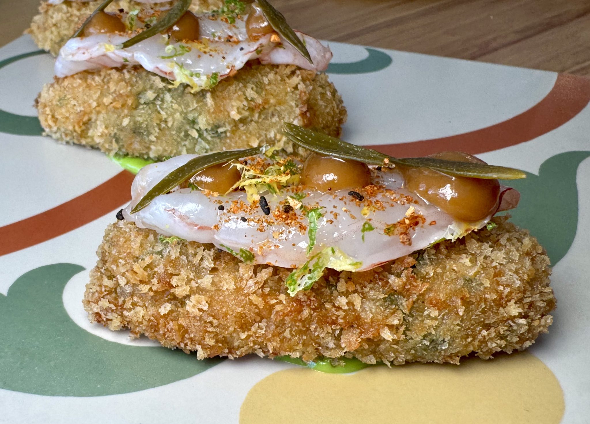 De las albóndigas de vaca madurada a las carrilleras de atún o los calamares rellenos de embutidos todo parece caber en un listado que respira personalidad y cierto desorden. Platos imprevisibles que recuperan sabores y armonías familiares con un solo pecado de juventud, su excesivo recargamiento. No tiene sentido que unas croquetas de jamón excelentes de besamel fluida y rebozo fino se sirvan cubiertas con tropezones de burrata y láminas de papada, que en parte las desfiguran. Más acertadas resultan sus sabrosas croquetas marinas que emulan el binomio “gambas amb bleda” (gambas y acelgas) donde las medias gambas se sobreponen a las croquetas en este caso con acierto. En todas sus sugerencias el homenaje a la tradición y no solo a la local, les lleva a recurrir a territorios próximos y lejanos.