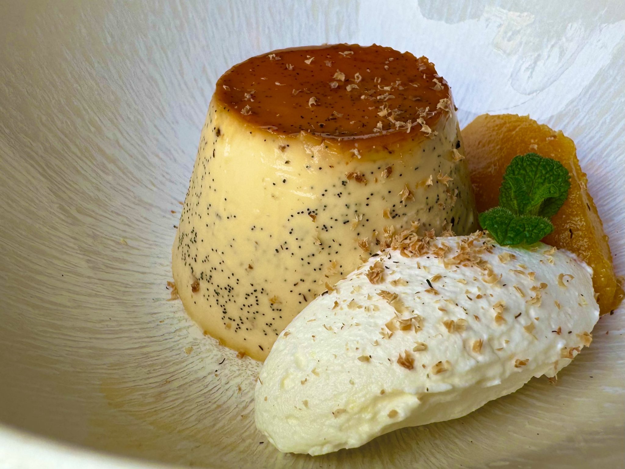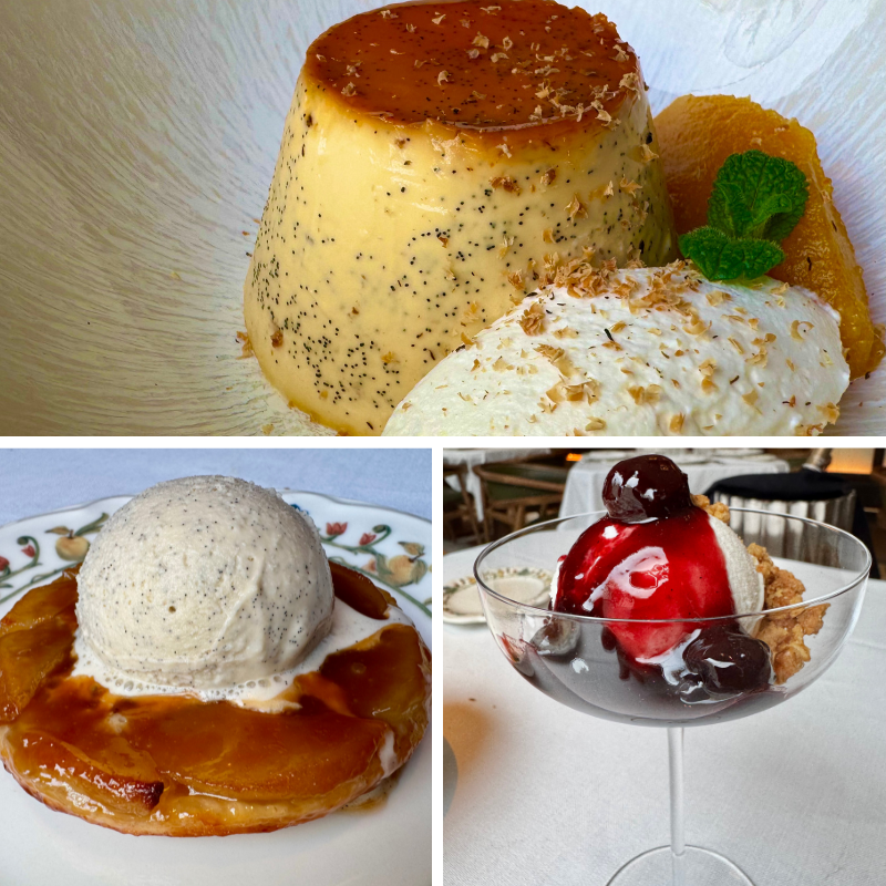 1.- Flan de vainilla. 2.- Tarta tatÍn de manzana. 3.- Helado de mascarpone con amarena.