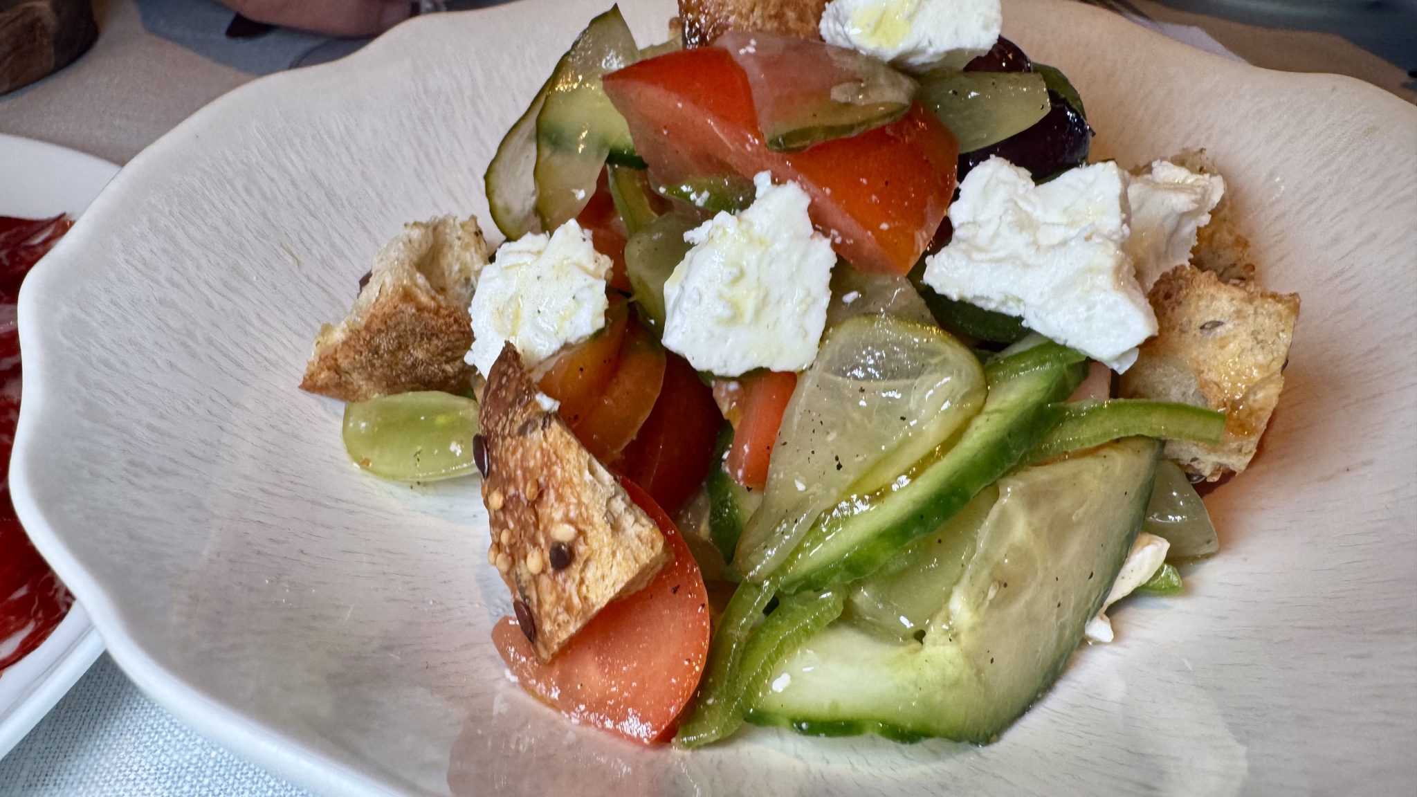 1.- Callos. 2.- Cecina de wagyu. 3.- Ensalada Metrópolis con tomate, queso feta y orégano. 4.- Ensaladilla con carpaccio de gambas.