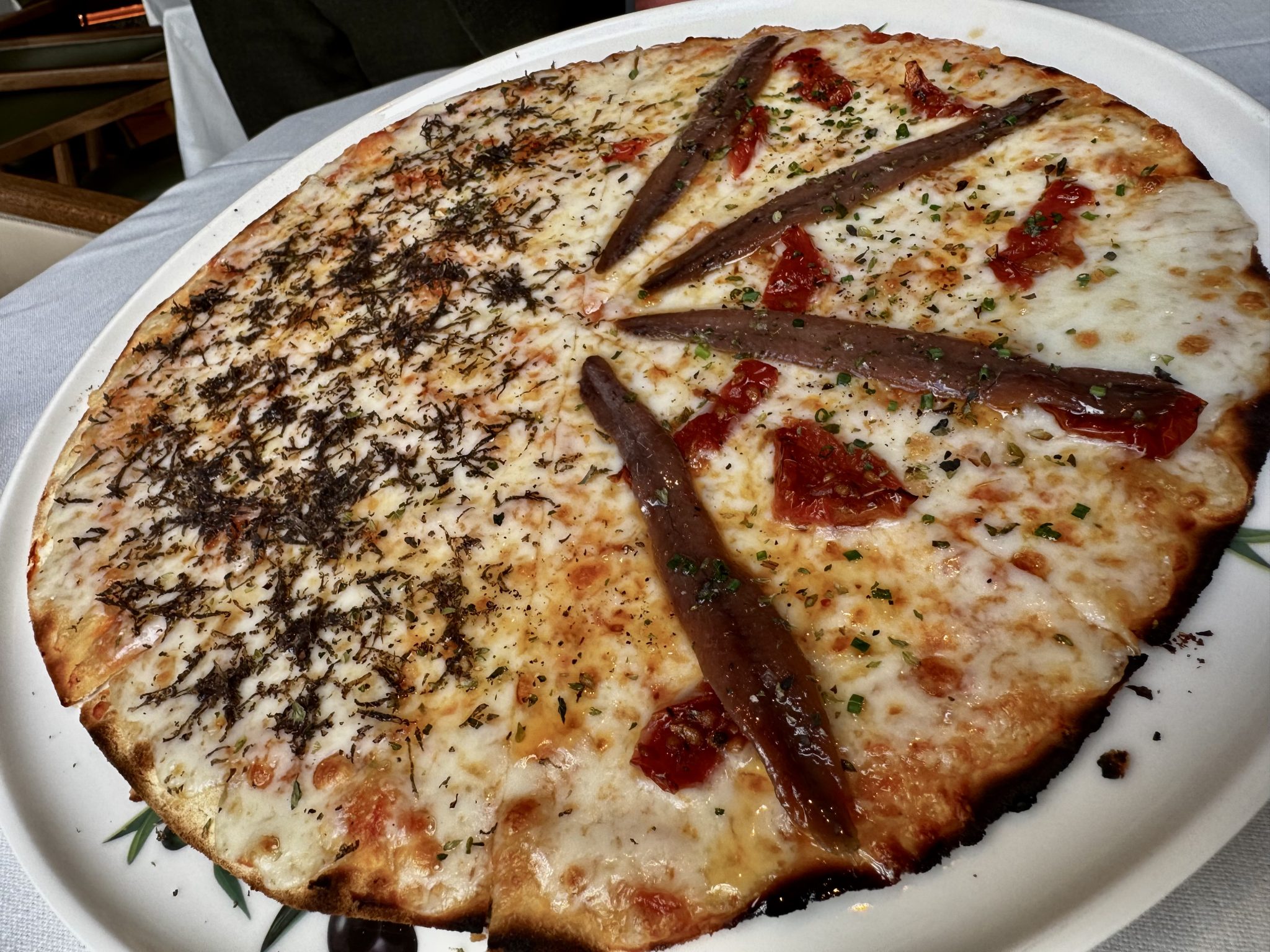 1.- Pizzas con anchoas y tomate, y con huevo, cebolla y trufa negra. 2.- Albóndigas de rabo y pure de patatas. 3.- Brocheta de lomo alto de black angus con chimichurri.