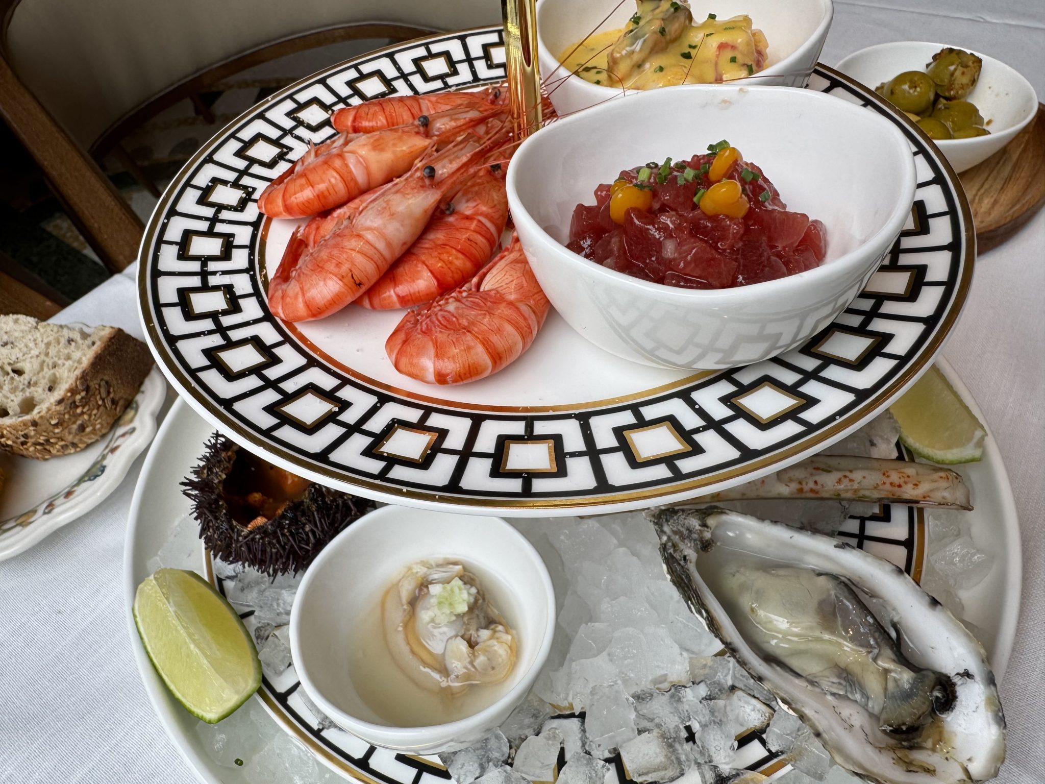 Convence la ensalada Metrópolis (pepino, tomate, queso feta y pan tostado) por el acierto del aliño, y pasa el listón la ensaladilla con velo de gambas en carpaccio. Siguen los mismos mariscos de la Barra de Oricios (camarones, erizos, almejas crudas, navajas y camarones) que también figuran en su carta a precios en consonancia con su calidad.
